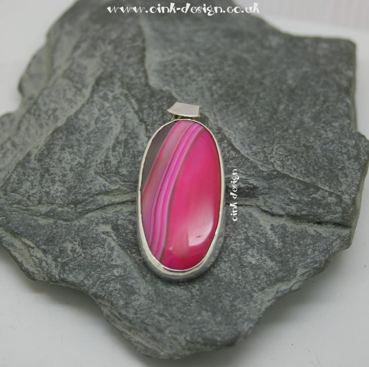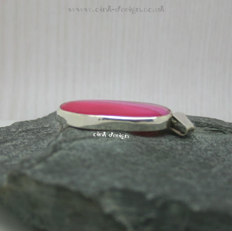A vibrant pink agate stone set in Sterling Silver with an open back to allow people to appreciate all sides of the stone.