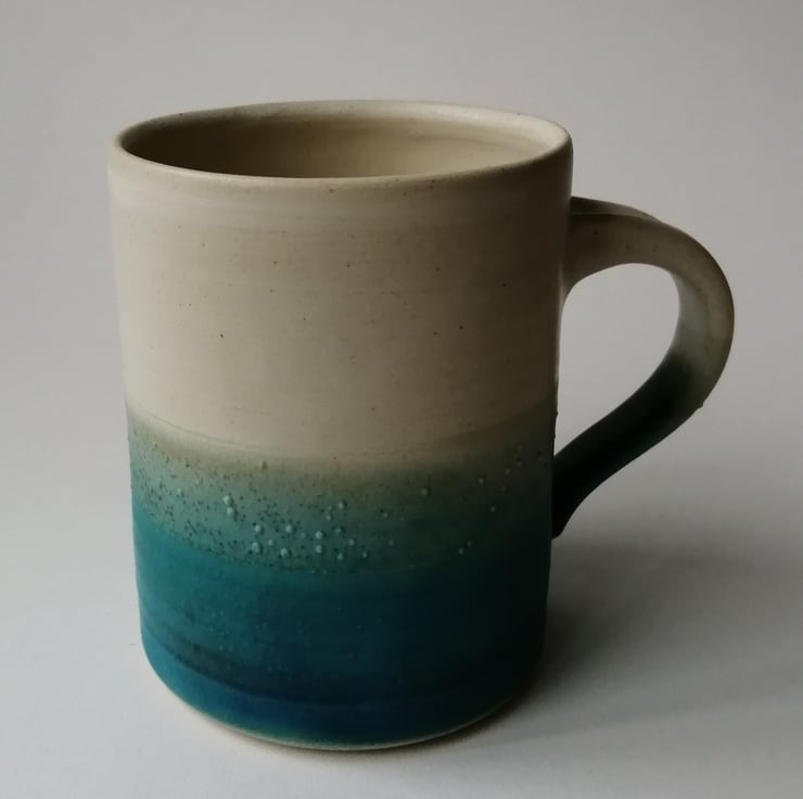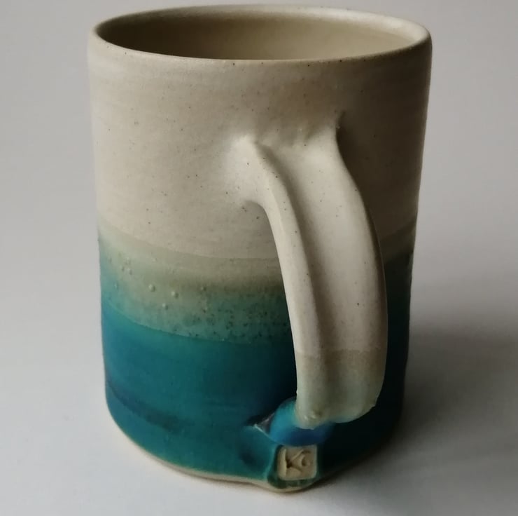 The inside of the mug has a clear glossy glaze. The outside has a blue-green mat glaze and a cream colour mat glaze above that. Where these 2 glazes meet and react there is some interesting colour and texture change.