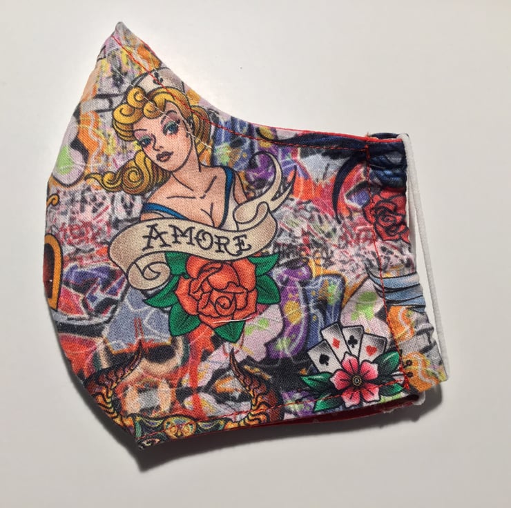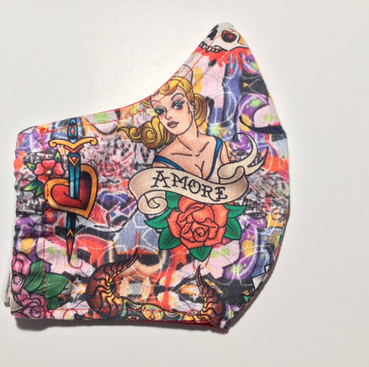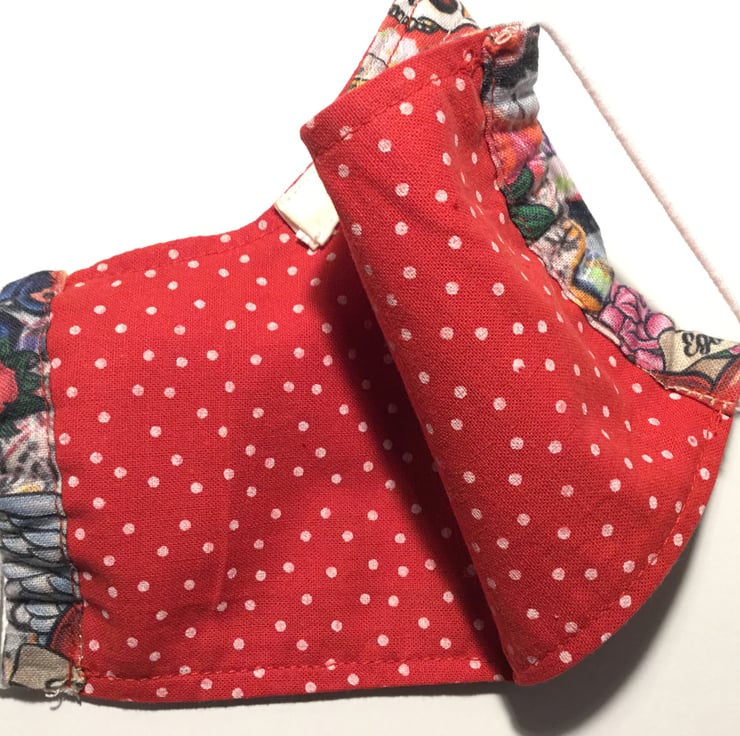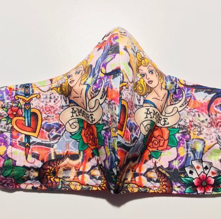 Stand out from the crowd in a Rockabilly face covering. Old school tattoo cotton fabric. The mask has a red polka dot lining and a nose wire, which can be removed and has elastic ear loops. Only 1 available.