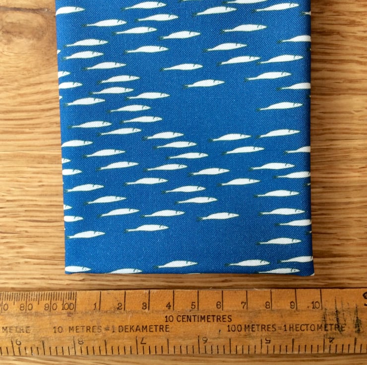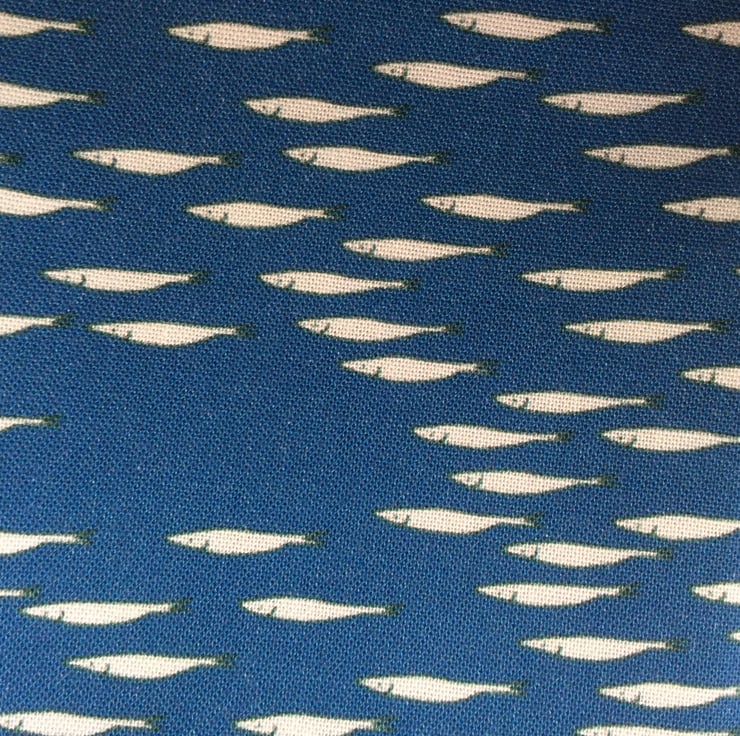 A fabric featuring shoals of fish. The main fabric colour is a petrol blue. An original design found only from Sea Parrot.