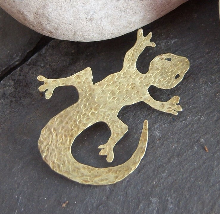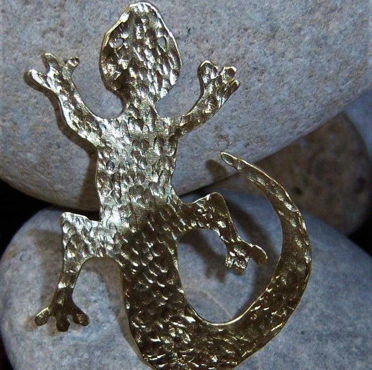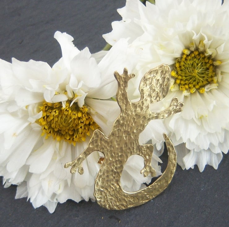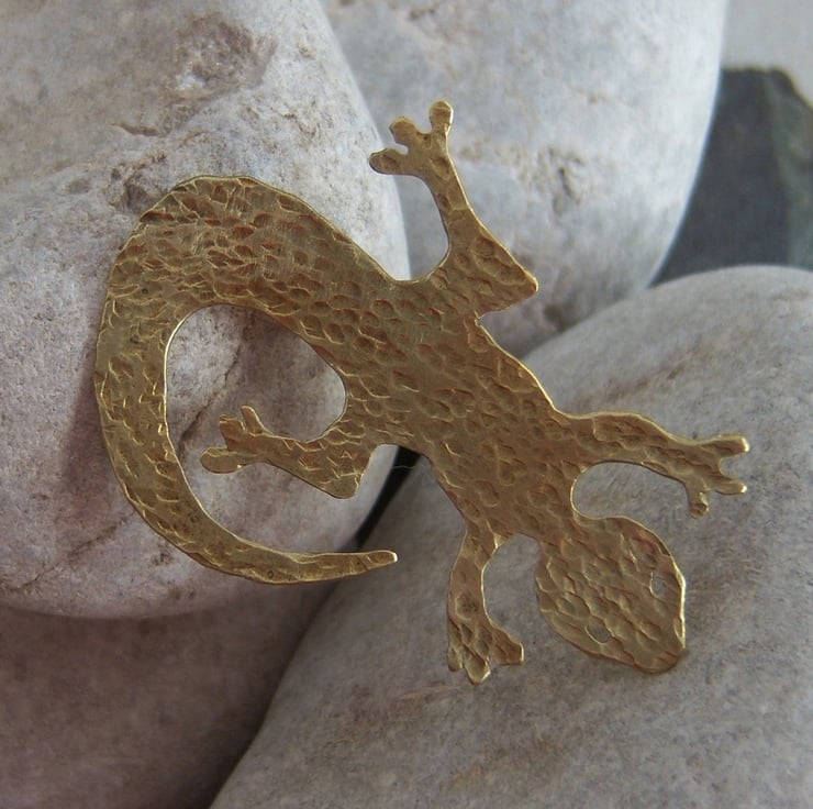 A lizard (or a newt, gecko or a skink?) cut from brass sheet, textured and finished with a sterling silver fastener. Approximately 4.5cms long.