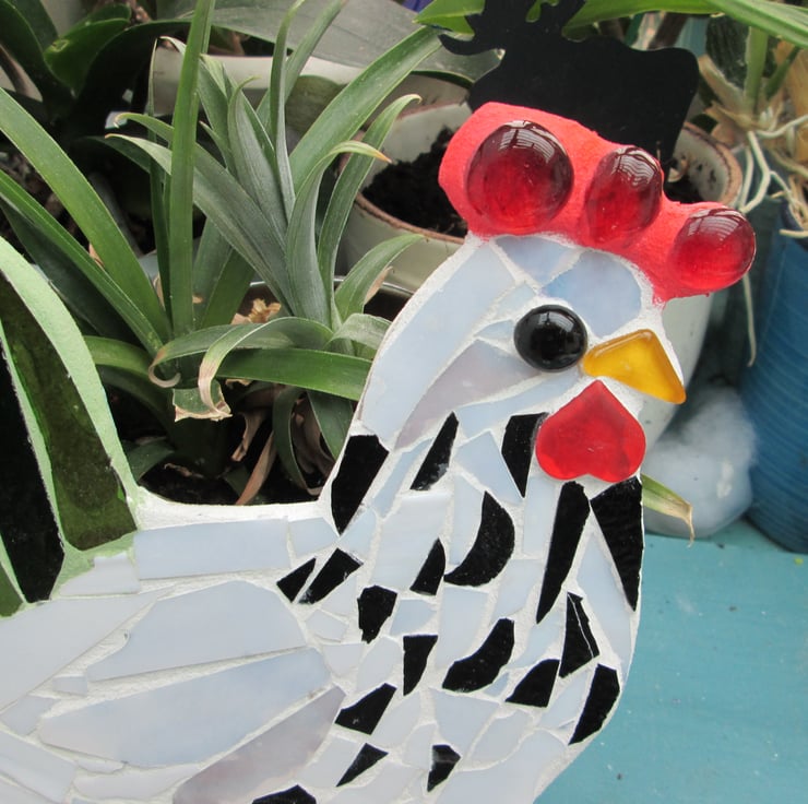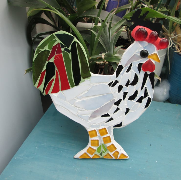 This mosaic Chicken is made from stained glass off cuts and glass nuggets, it is 24cm x 22cm in size and comes with a hanging attachment on the back.