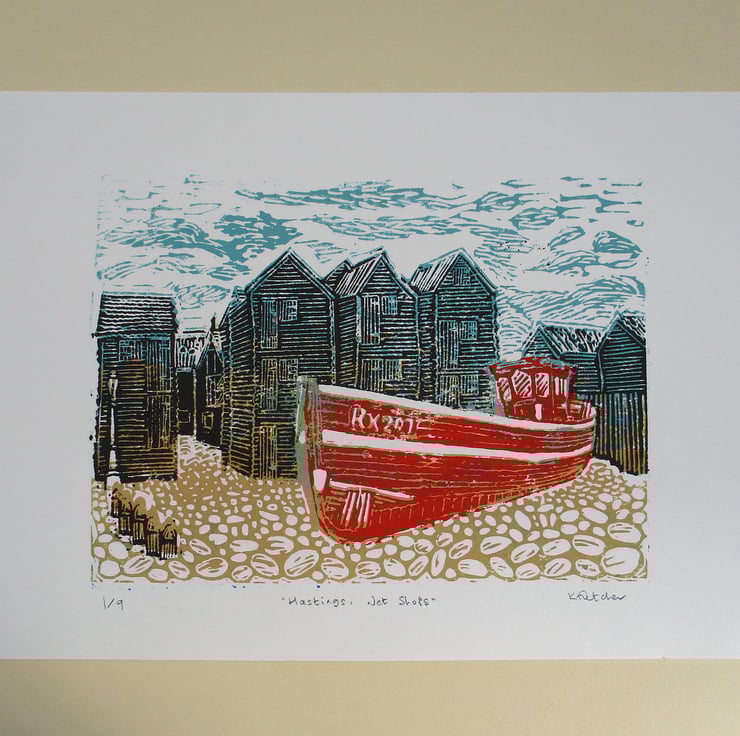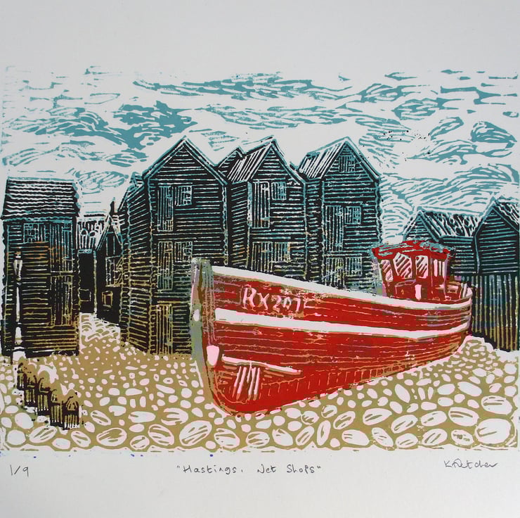 This is an original 4 colour linocut print of the striking net shops in Hastings Old Town on the East Sussex Coast. This is the second design I have created of the net shops.