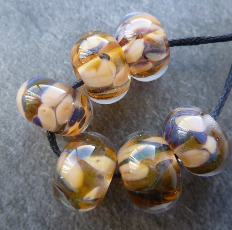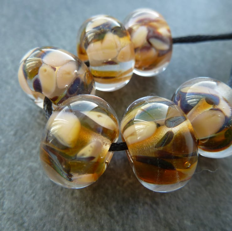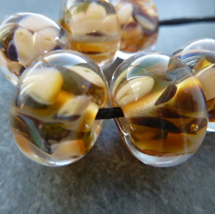 A set of 6 lampwork glass beads made with clear glass, rolled in frit and encased in clear glass.