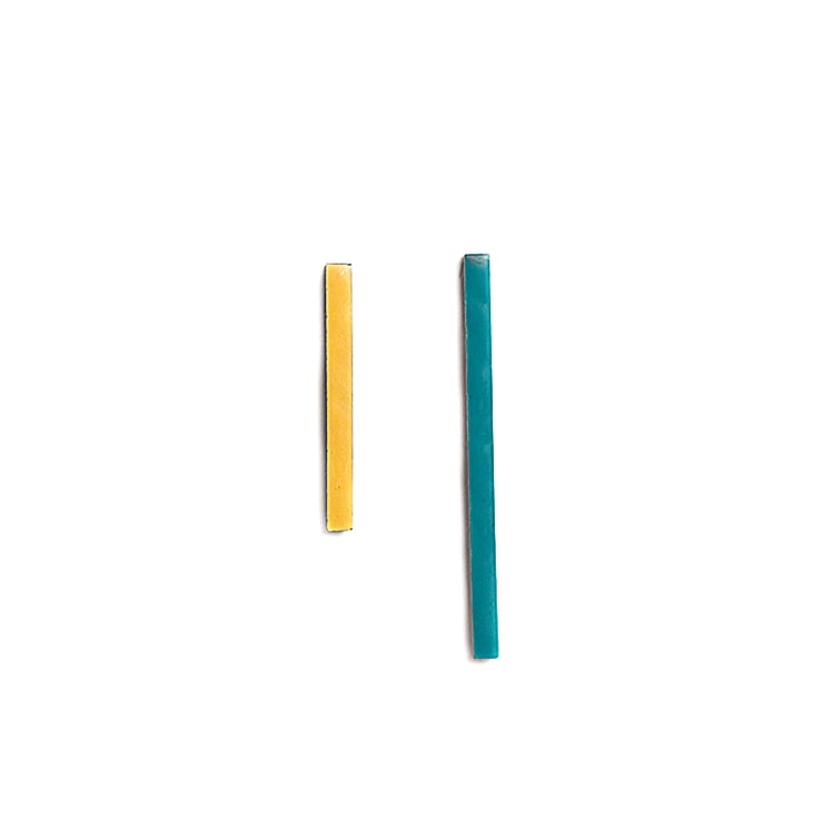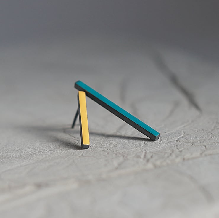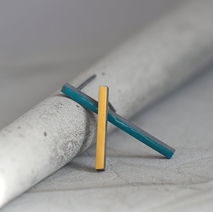 Minimalist geometric stud earrings made from sterling silver and yellow and turquoise jewellery enamel. Have been oxidised for a deep black colour. Yellow and turquoise enamel on the front make great contrast with dark silver. These earrings are asymmetric, one turquoise long earring and one yellow shorter.