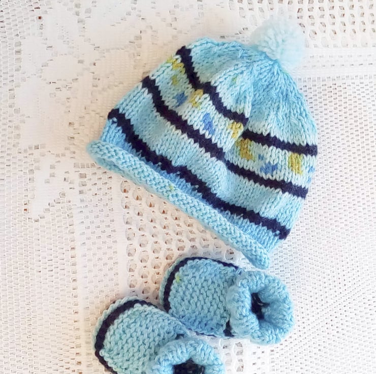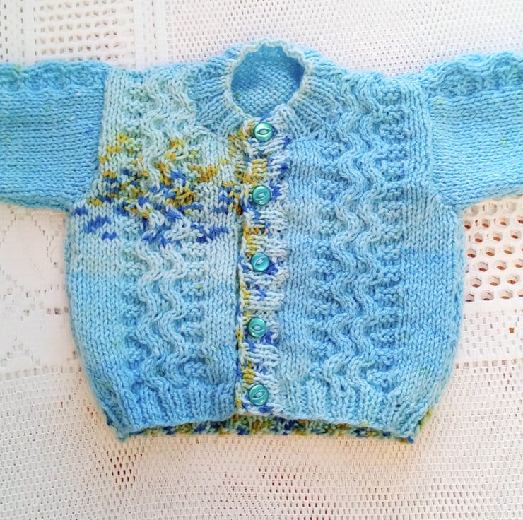 A cute baby's shorts, cardigan, hat and bootees set is hand knitted in shades of navy and blue double knitting weight yarn. It would make an ideal gift for a new baby or a baby shower or a Christening, or a lovely treat for your own little one.