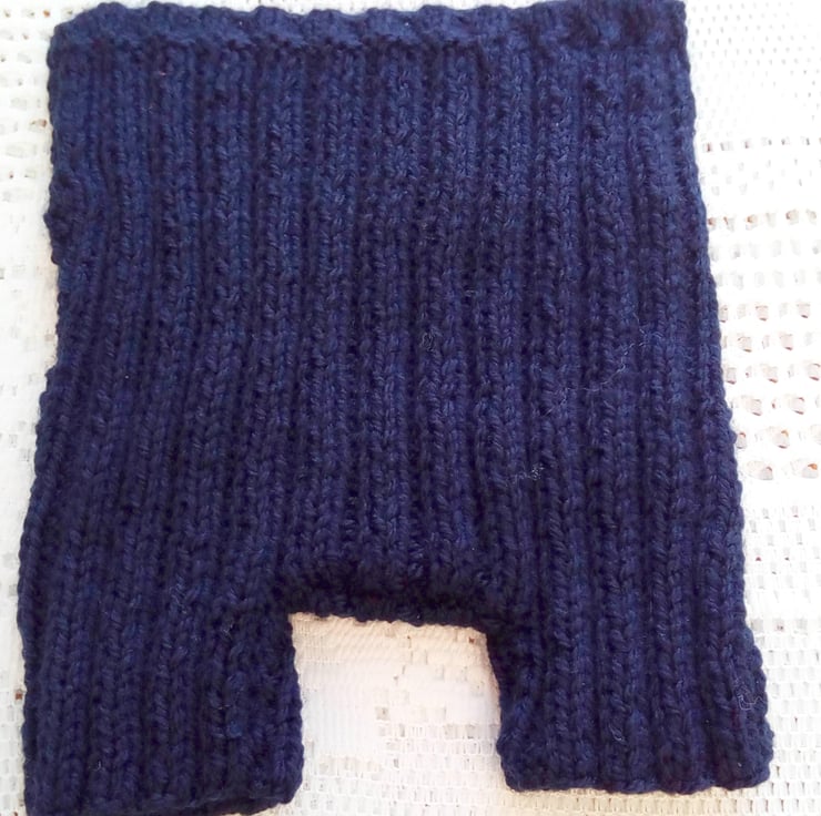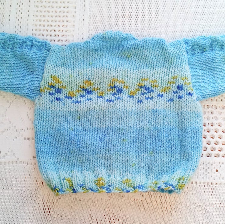 The trousers and jumper set is in stock in this navy and blue colour combination and is to fit a 0 - 3 month old baby with a 16 inch chest. The set can be made in other colours and sizes for you, please state the colour(s) required when you order and the available sizes and prices are shown below. The processing time for this set will be 1 - 2 weeks to produce and post to you.