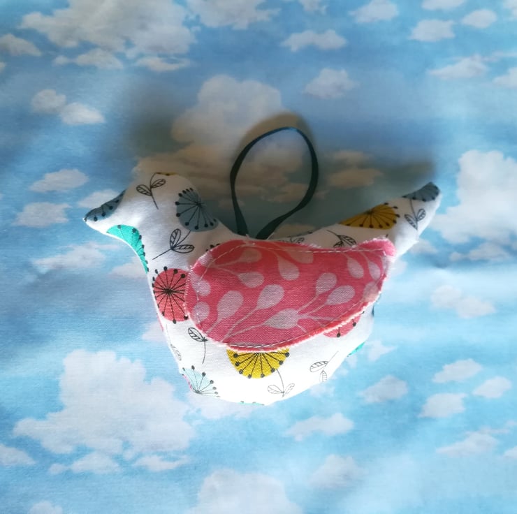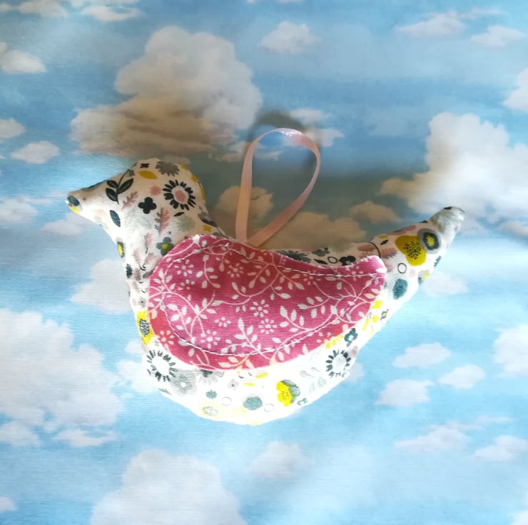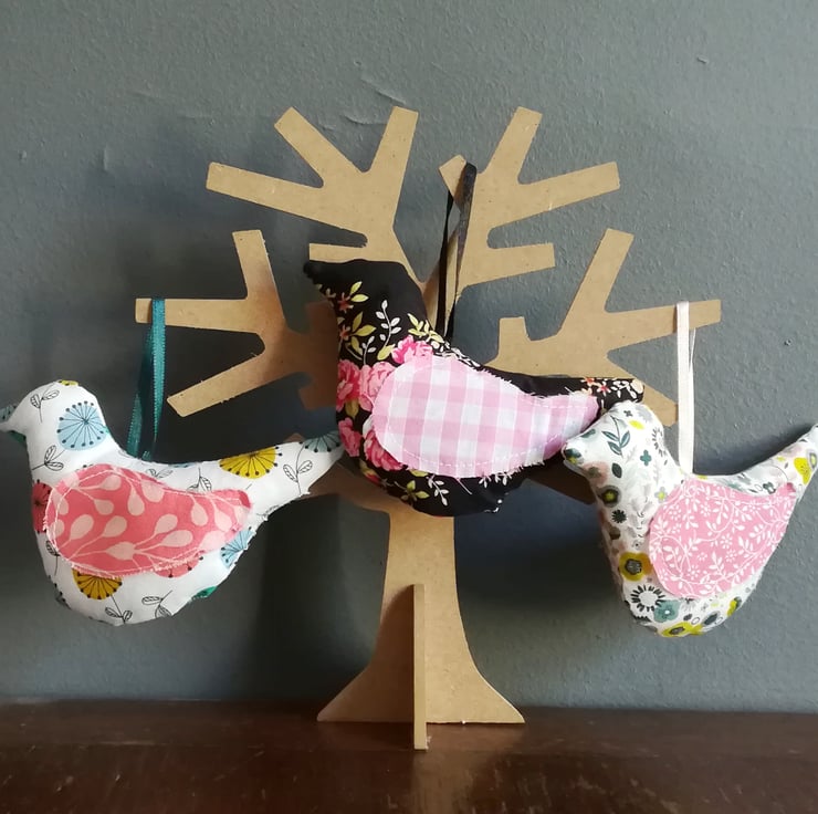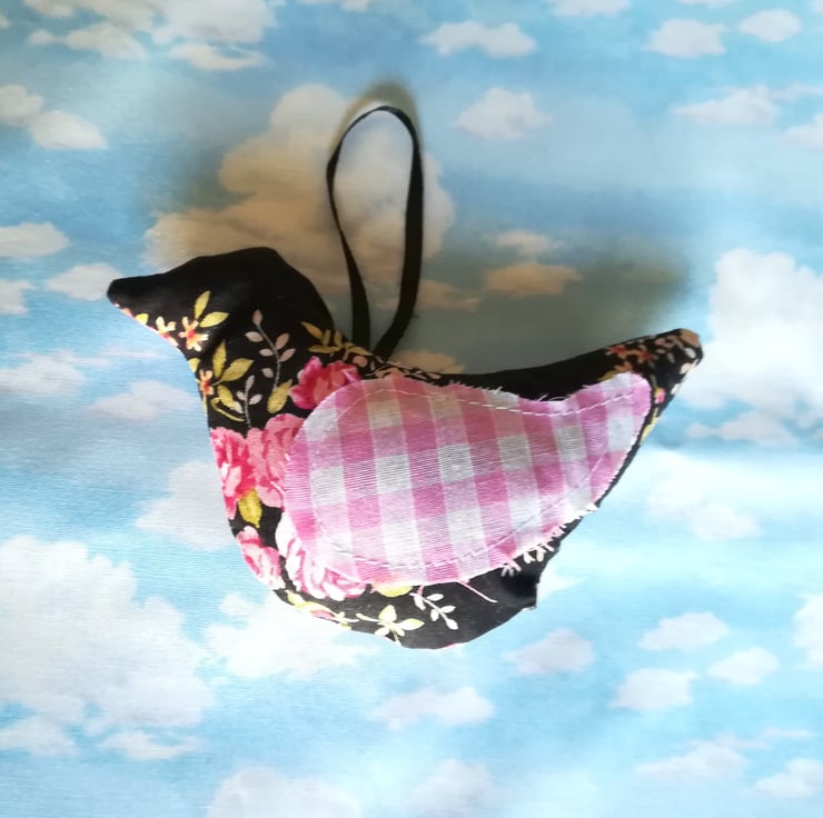 These simple little bird silhouettes are made from a mixture of pretty floral fabrics with raw edge applique wings sewn on both sides with an upcycled ribbon to hang them from. They would look pretty in a window or hanging from a shelf or ceiling in your kitchen, living room or nursery. There are some tweed versions of these little birds also in my shop, please take a look. Please choose which bird you would like from the drop down options menu.