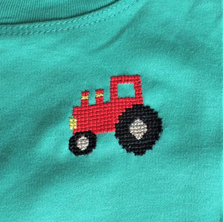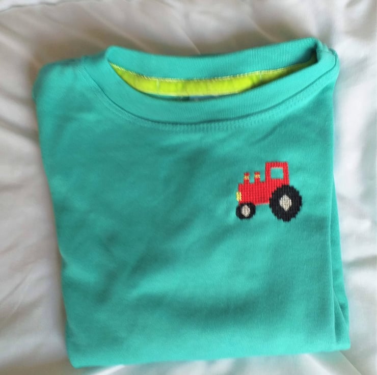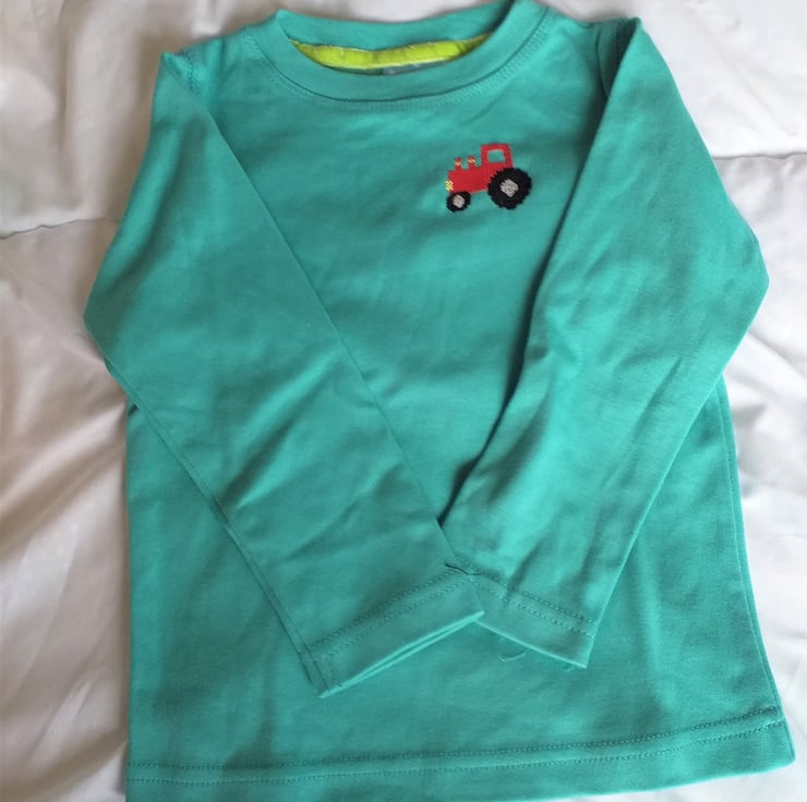 This is a lovely turquoise long sleeved T-shirt, for a 3 year old. On the left front I have hand embroidered a red tractor from a sketch of my own. The shirt has a soft velvet band inside the back of the neck. It is 100% cotton and machine washable.