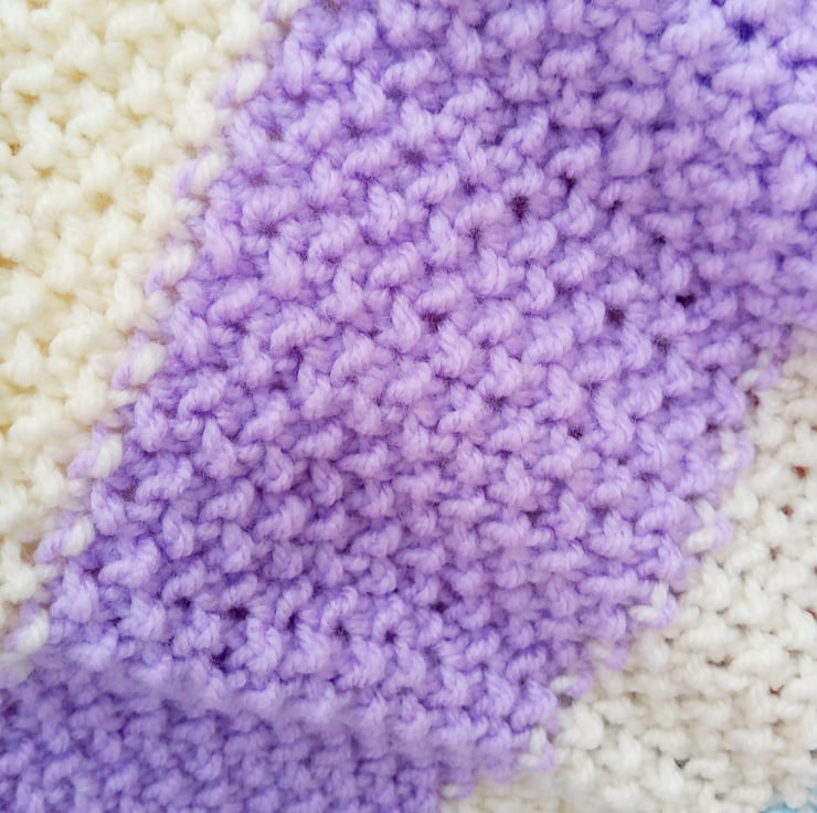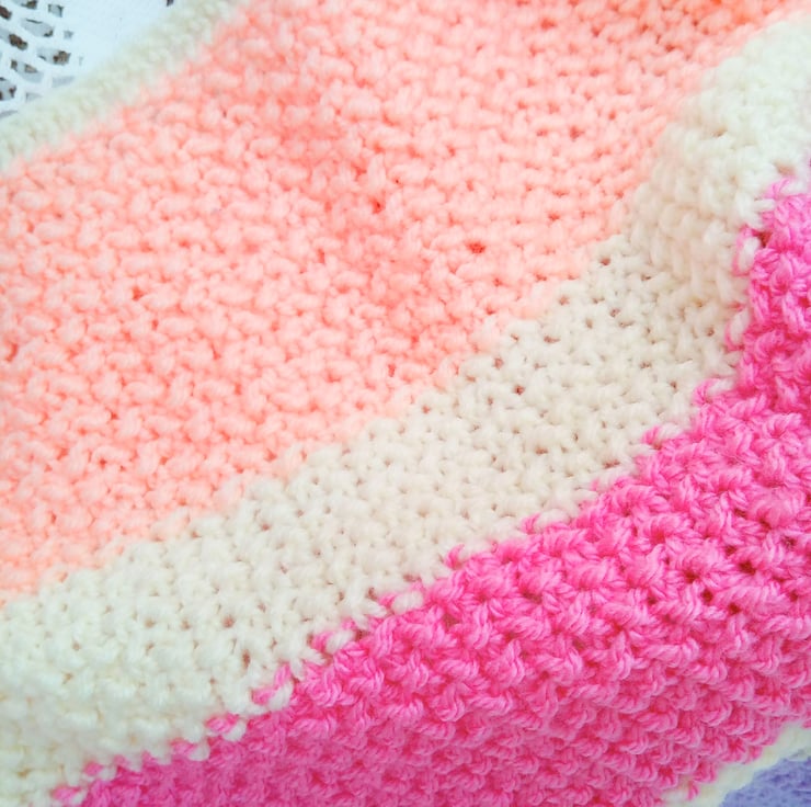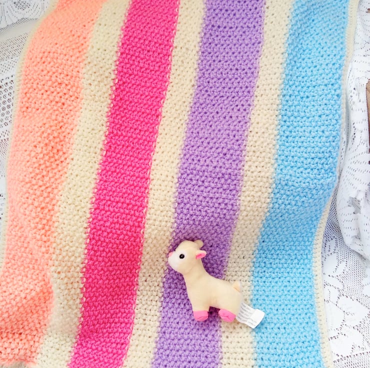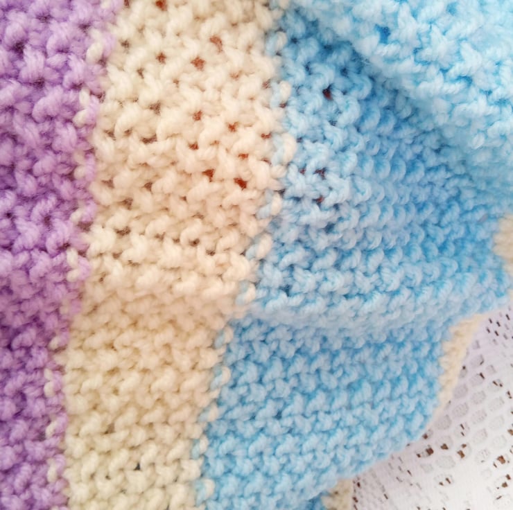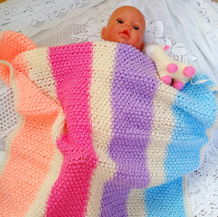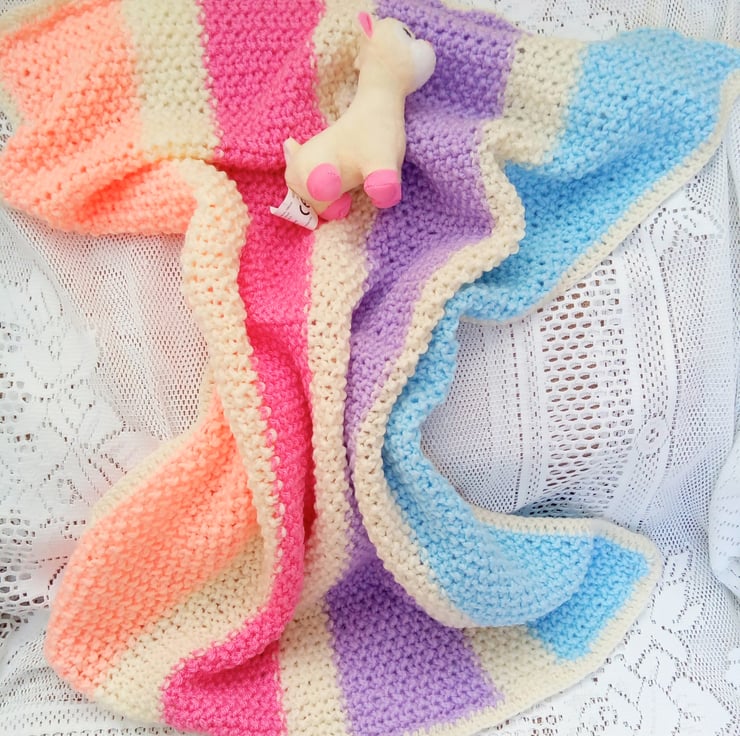 Beautiful striped baby blanket. It is hand knitted in soft aran weight yarn which gives it a bit of extra warmth. The overall measurements of the blanket are approx. 28" (71 cm) x 23.5" (59.75 cm).