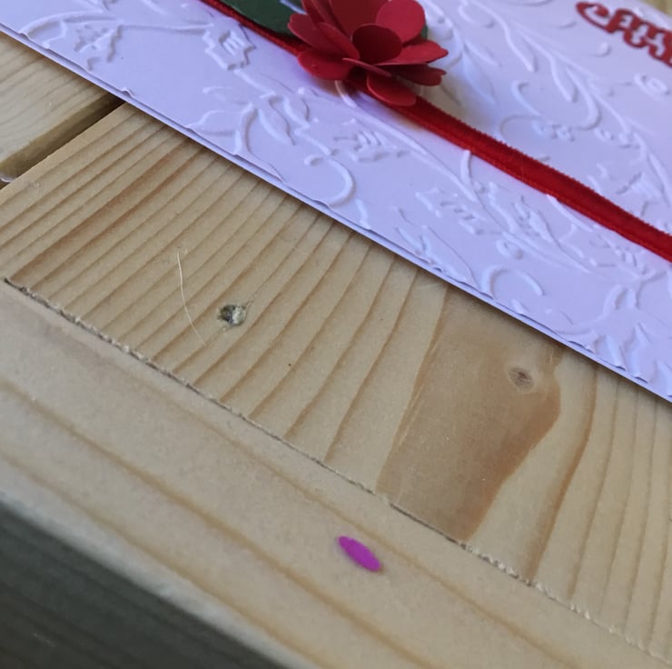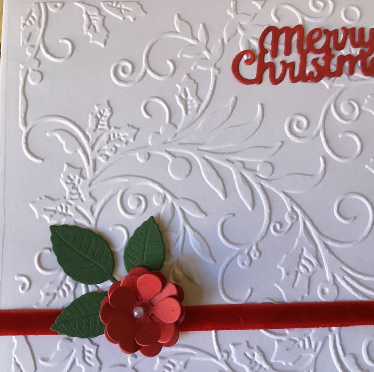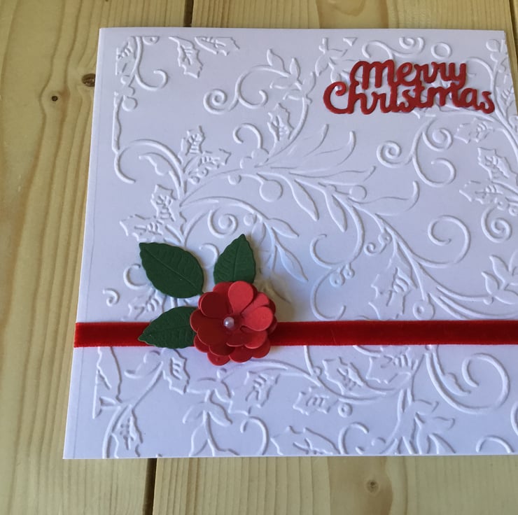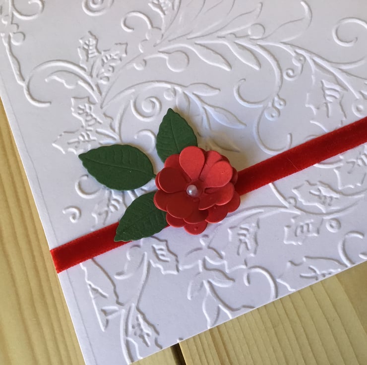 The handmade rose sits on a velvet red ribbon band which is on an embossed christmas background.