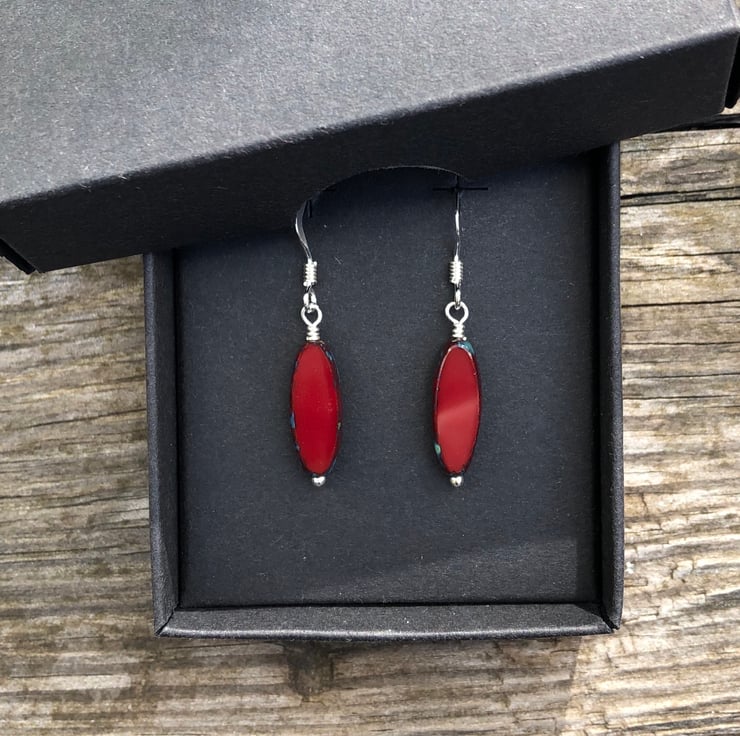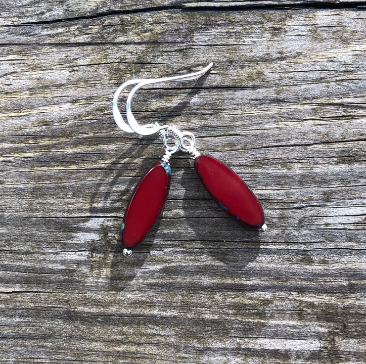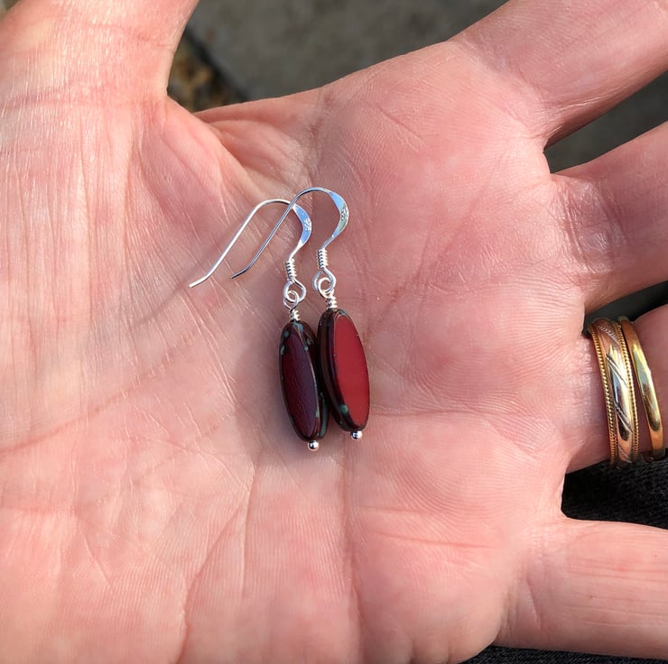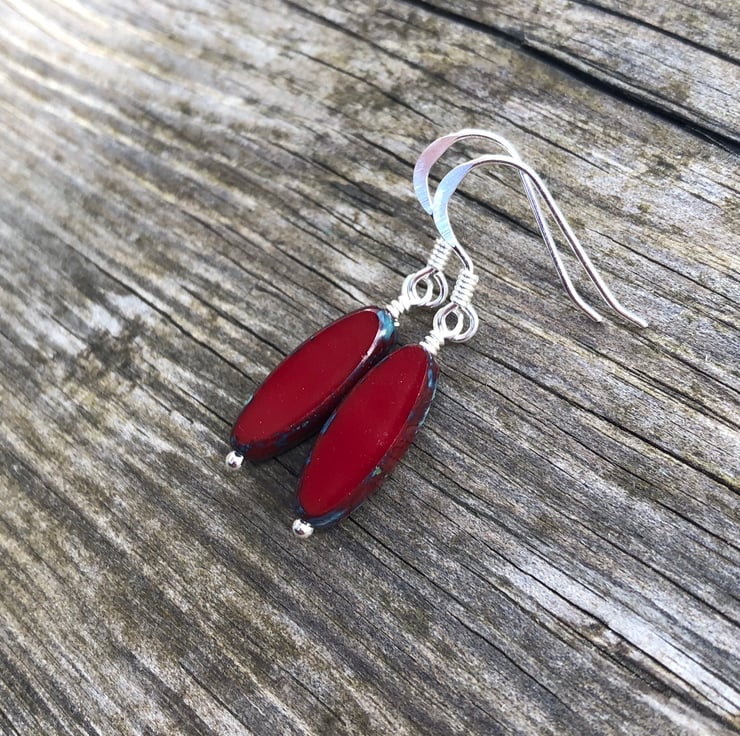 These stunning rustic Picasso dark red Czech glass beads have simple hand wired onto a sterling silver headpin and hung from matching fish hook earrings.