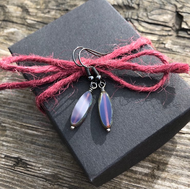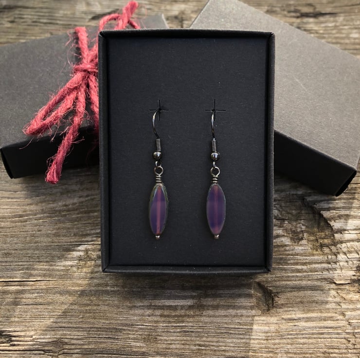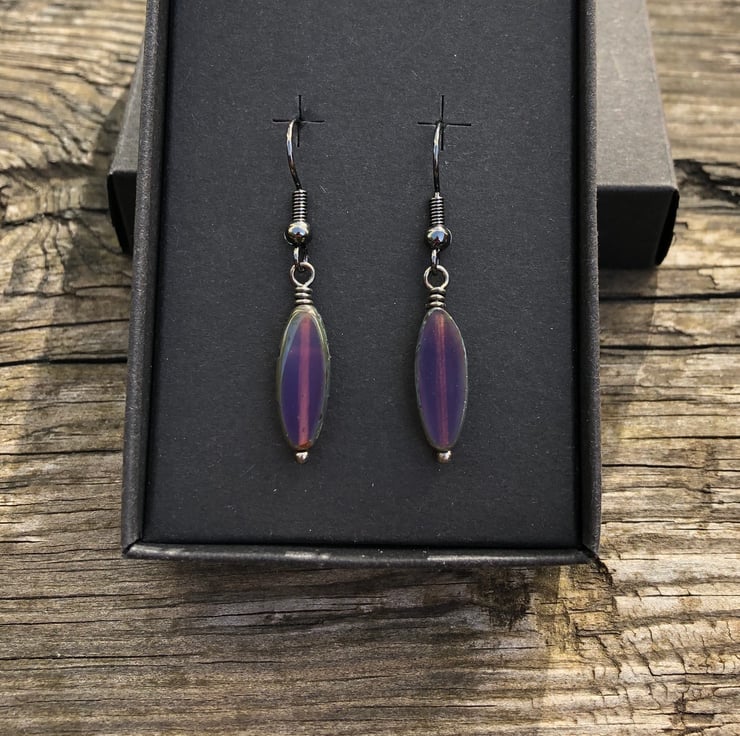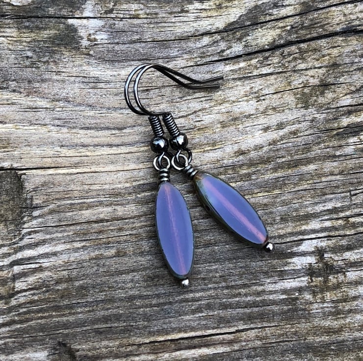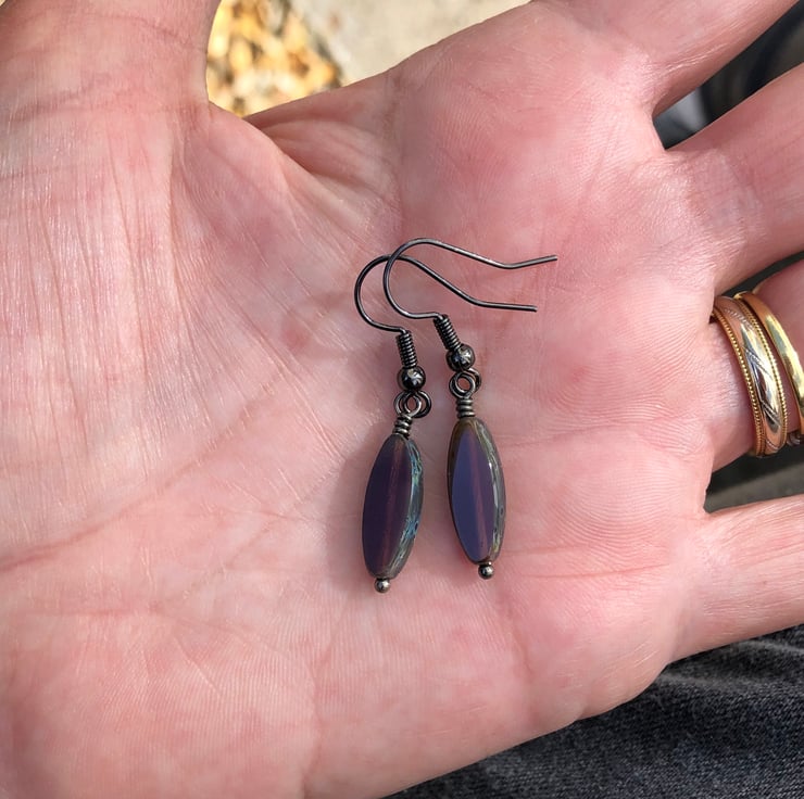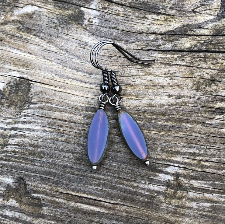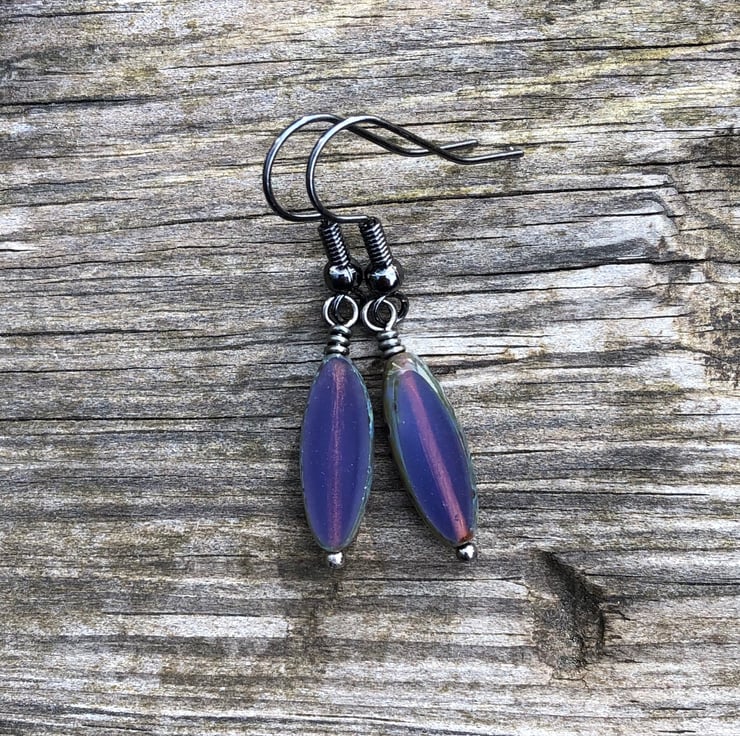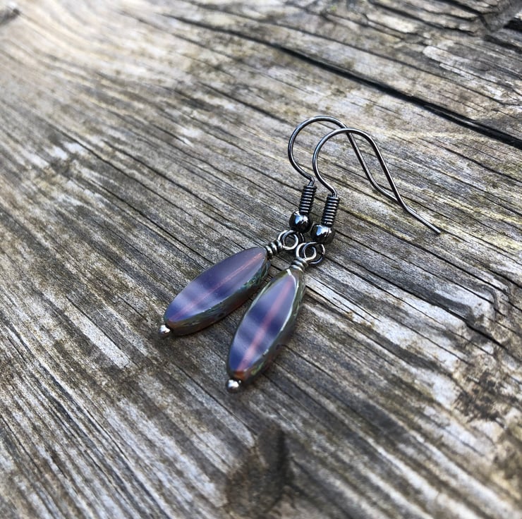 These stunning rustic Picasso opal purple Czech glass beads have simple hand wired onto an antique black headpin and hung from matching fish hook earrings.