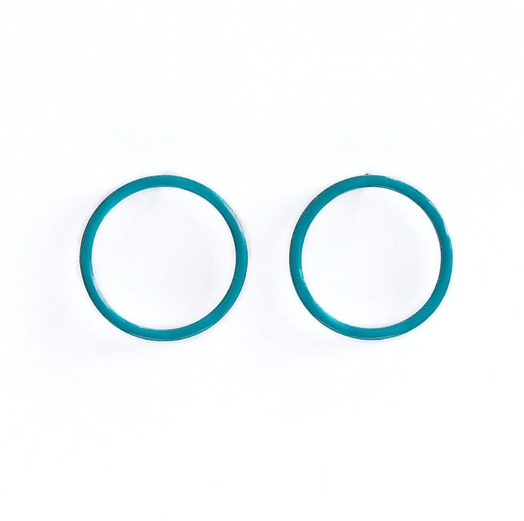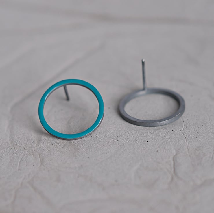Minimalist geometric hoop stud earrings made from sterling silver and turquoise jewellery enamel.