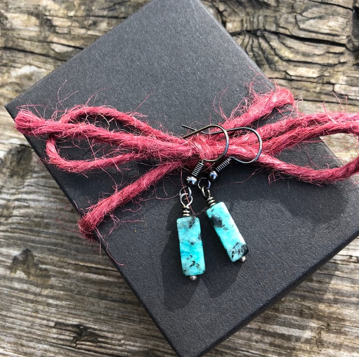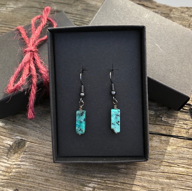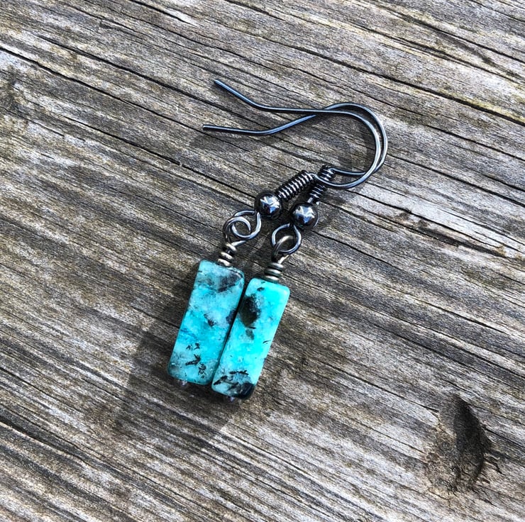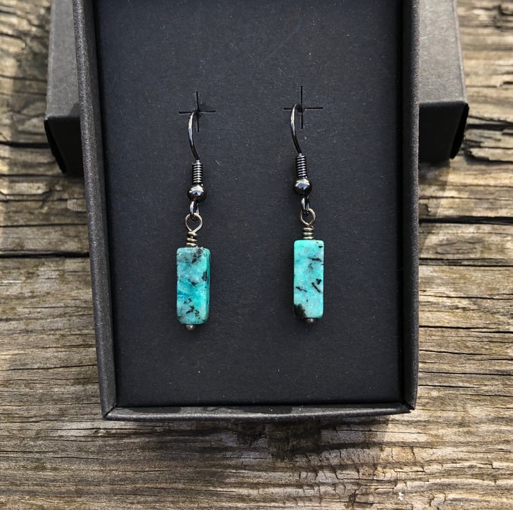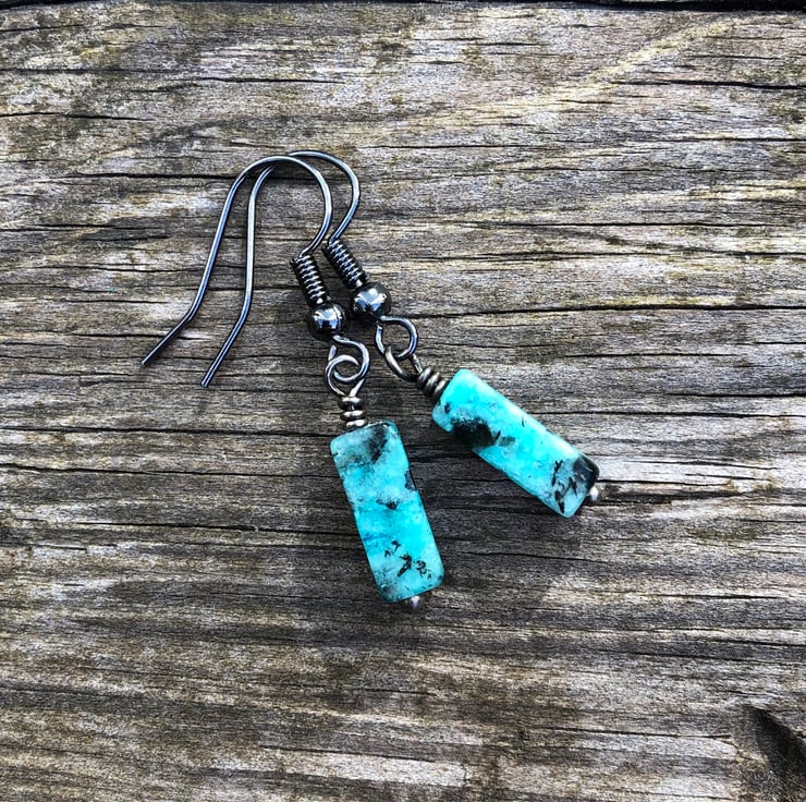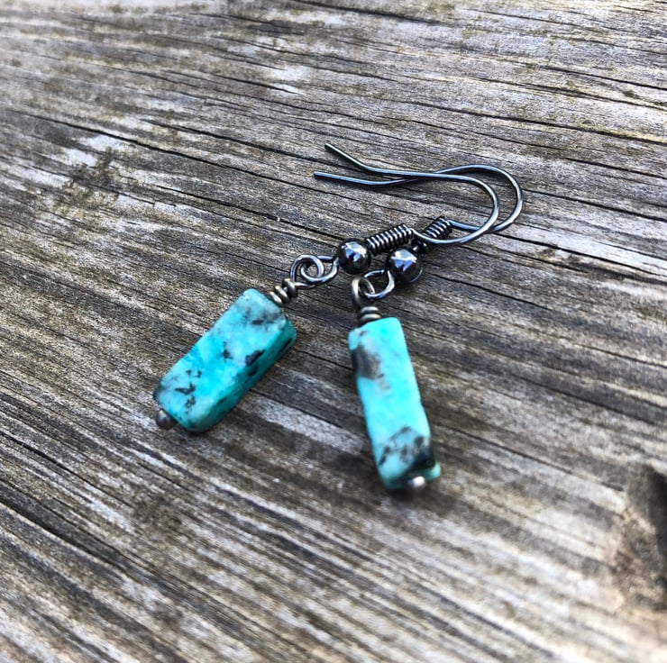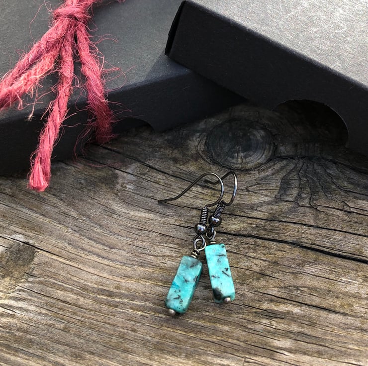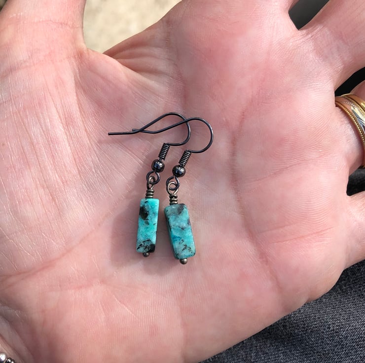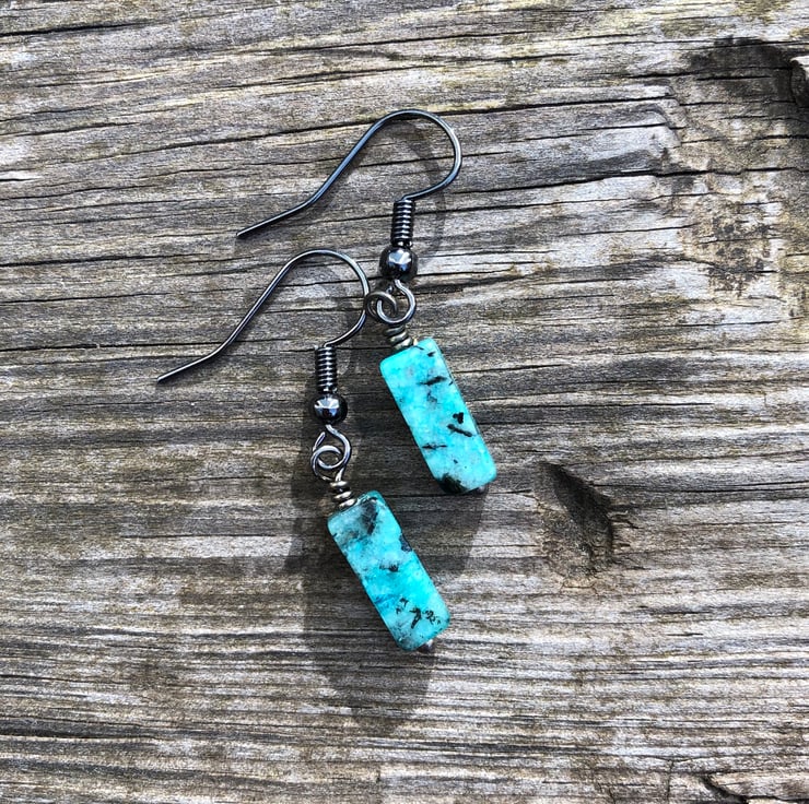 These lovey turquoise natural stone beads in a tube form have been simple hand wired onto an antique black headpin and hung from matching fish hook earrings.