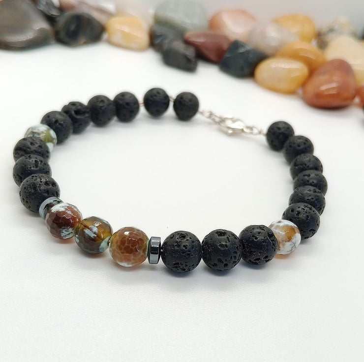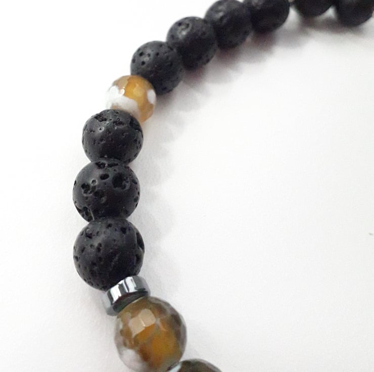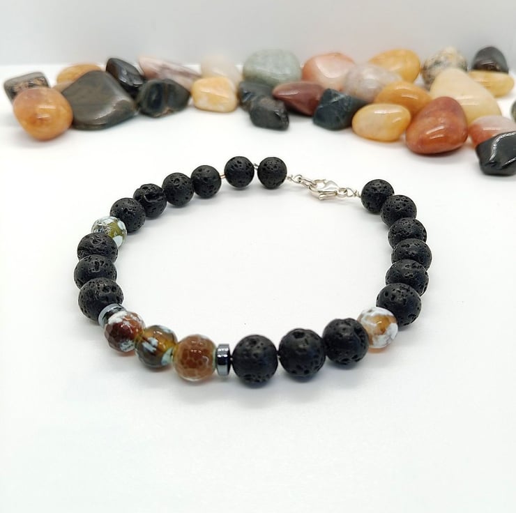 Black Lava Gemstone bracelet with 5 Amber coloured Fire Agate gemstones Beads, finished with Sterling Silver lobster claw fastening and ring.