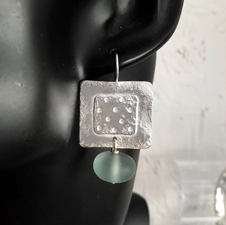 Squares of silver have been fused and I have a punched dotty pattern in the centre. They have a hook soldered to them.