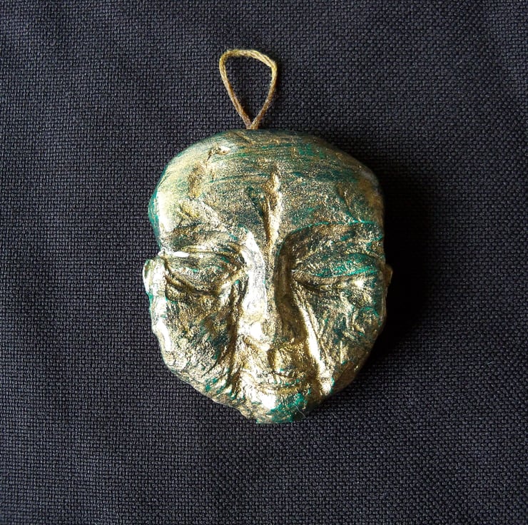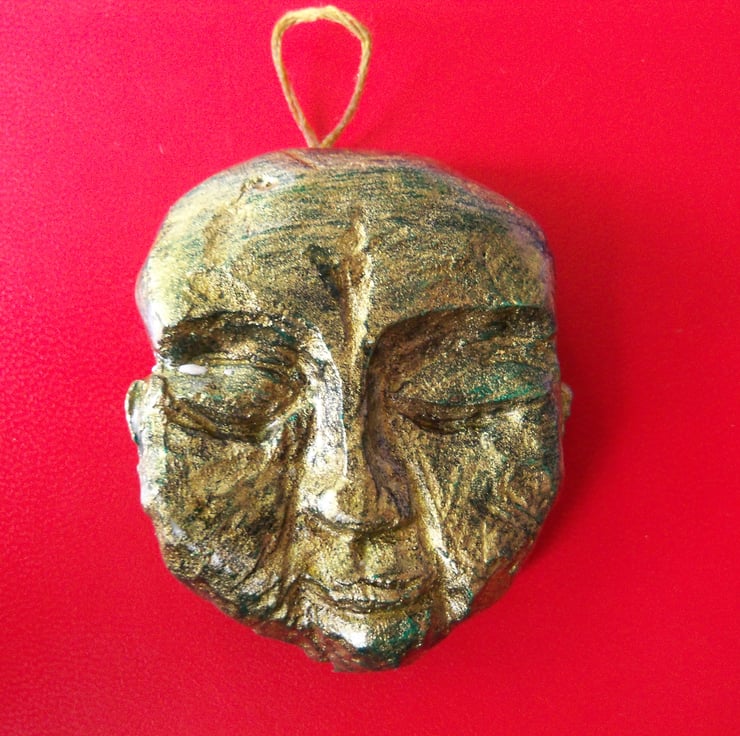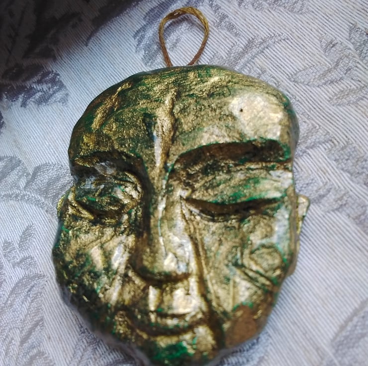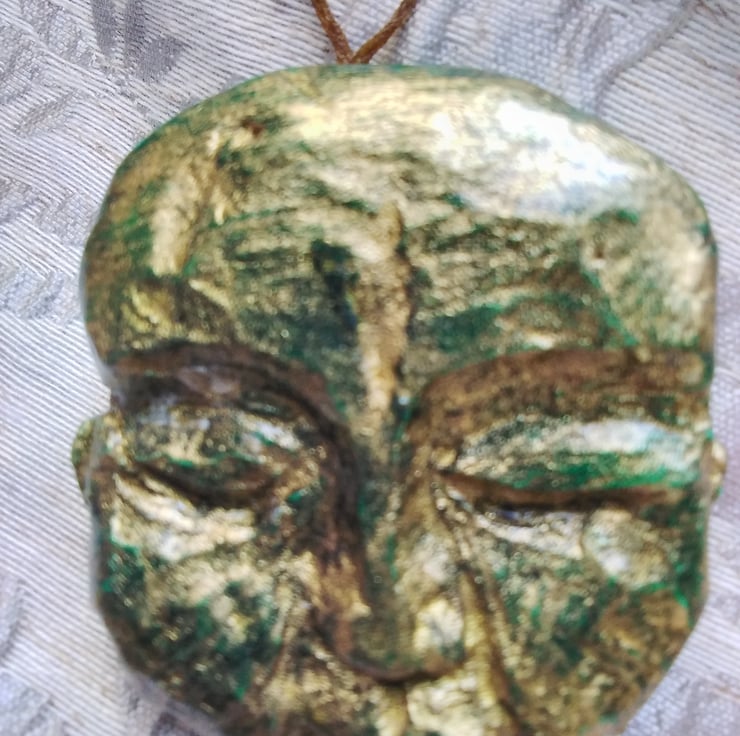 Here is a small face - size about 6 c.m. x 5 c.m. - carved from a slender block of plaster of Paris, then painted in green and gold acrylic, and finally varnished to give it a nice sheen and to protect its surface. It is hung by means of a short loop of golden embroidery thread, papered and glued to the reverse, and then varnished to give it strength. The carving is very small and light. Ideal for hanging in small spaces, or on a wall crowded with all your other pieces of unique art.