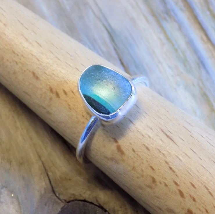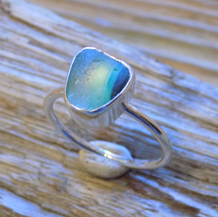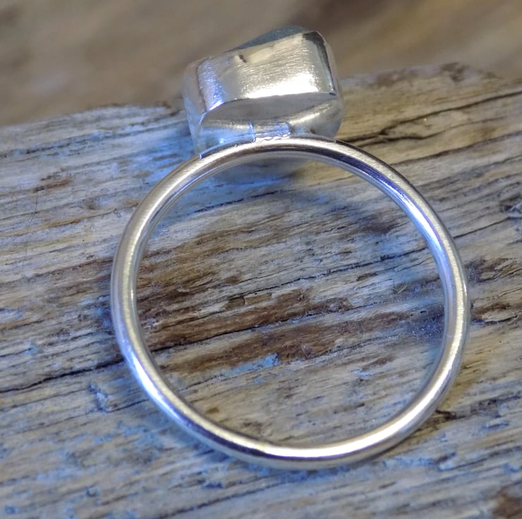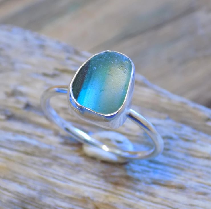 Made from sterling silver sheet and wire. The glass is a multi that catches the light beautifully, and sits in it's custom made bezel snuggly. Size UK X 1/2 as requested.