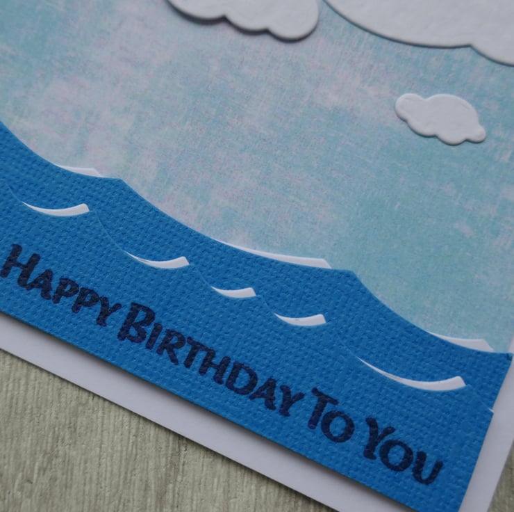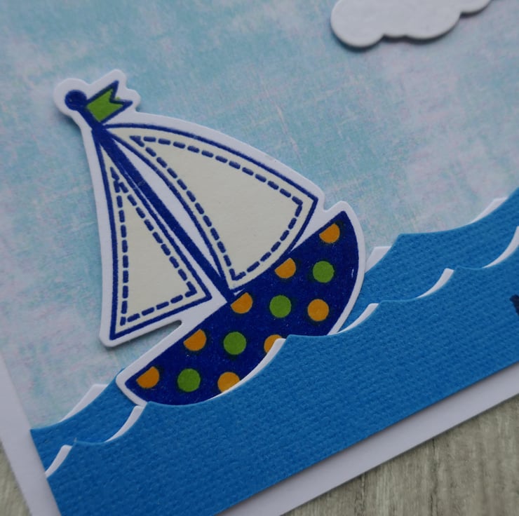 A piece of blue and white paper has been attached to the card leaving a border around the edge. Waves have been die cut from both blue and white card and layered. 'Happy Birthday To You' has been stamped along the lower edge. The boat has been stamped in blue ink and embossed to give a lovely shiny image. It has been coloured in green and gold with cream sails. The boat has been die cut and attached to the card between the waves. Three white clouds adorn the top of the card.