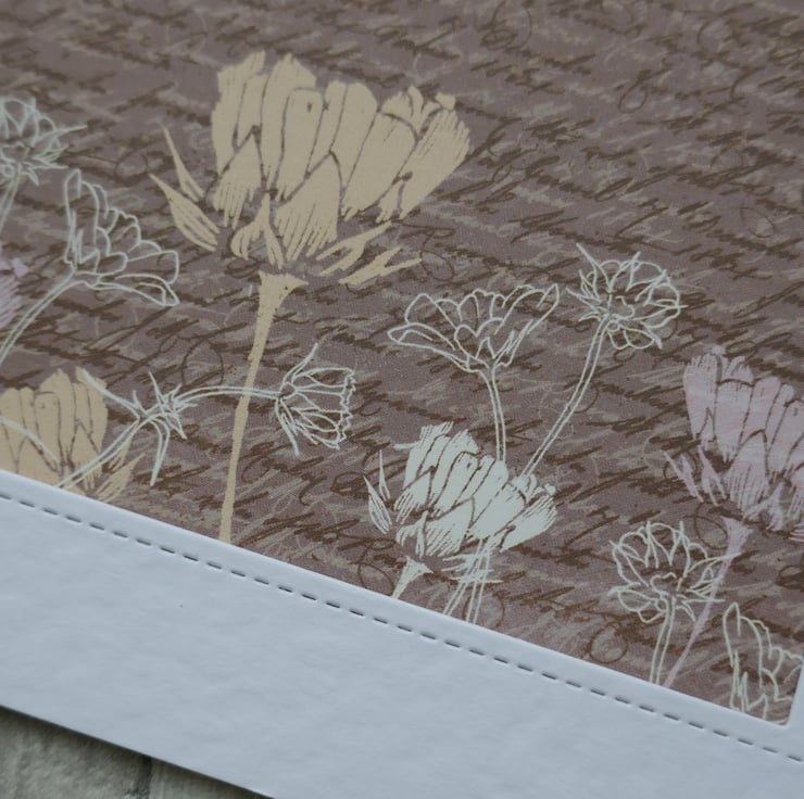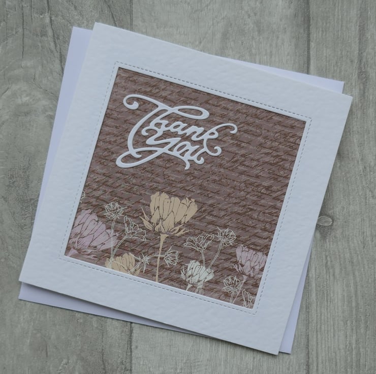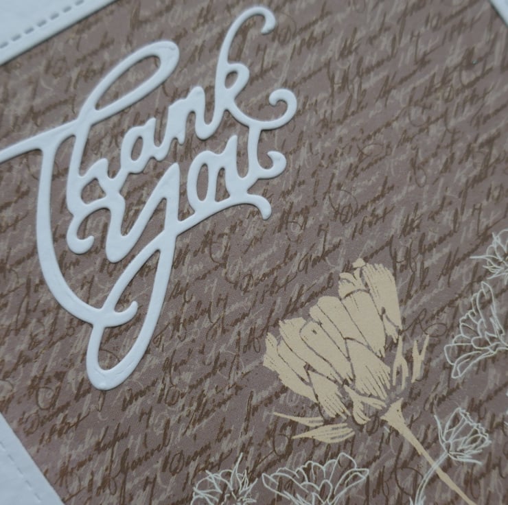 A stitched aperture has been die cut in the centre of the card and the floral patterned paper with peach, pink and cream flowers has been attached behind the frame. 'Thank You' has been die cut from white card and attached above the flowers.