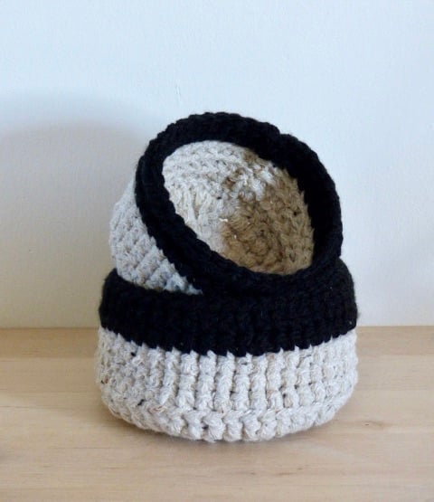 Two crocheted baskets in chunky natural and black yarns. The natural yarn is an acrylic/cotton/wool mix and the black yarn is 100% acrylic. The larger basket measures 15cm in diameter by 7cm high and the smaller measures 12cm in diameter by 6cm high. Ideal for keys, a plant pot, or any other use you like.