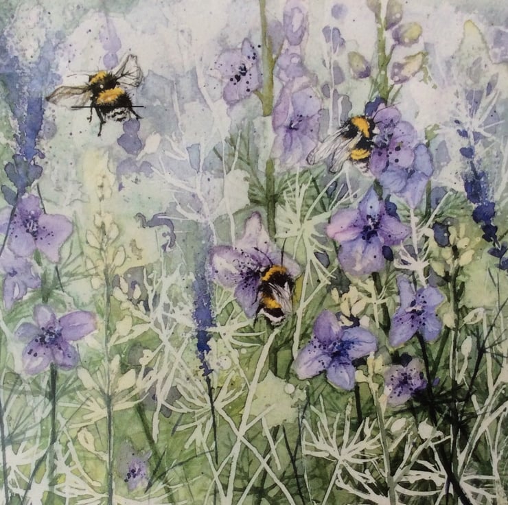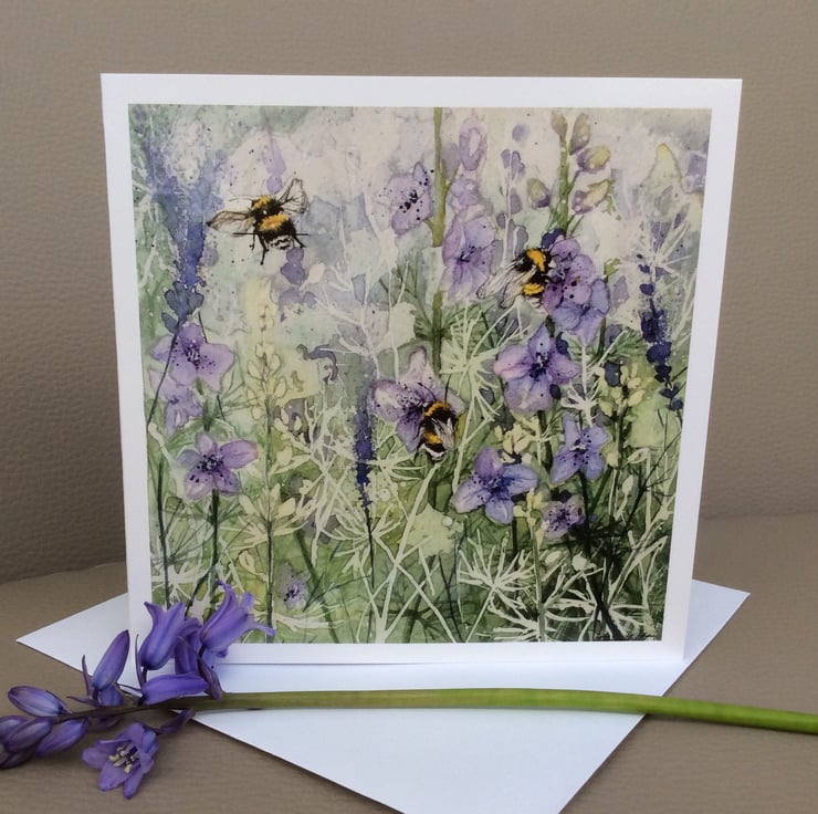 Need a card fast? Why not keep this beautiful set of 3 greeting cards in a drawer just in case you need a card in a hurry? I specialise in creating watercolour paintings and greeting cards. This set of cards are limited edition prints of my original watercolour painting of ‘Bees and wildflowers’.The image has been printed onto card and has a high gloss finish. The cards are blank inside for your own personal message and come with white envelope. Dimensions are approximately 14cm. x 14cm.Thank you for looking at my work.