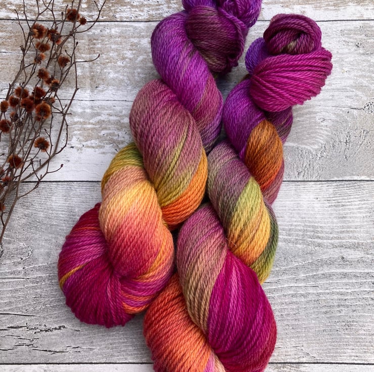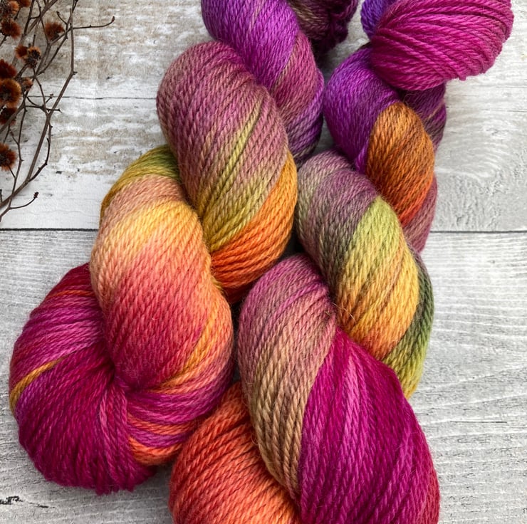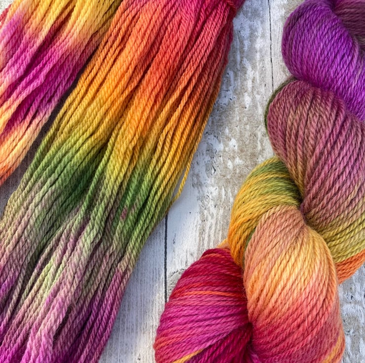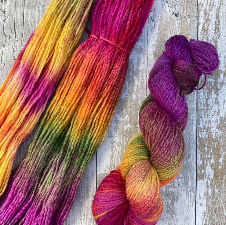 Skein of hand dyed Kent Romney yarn as shown.