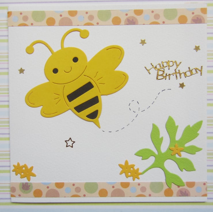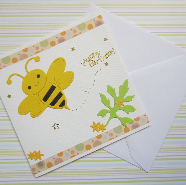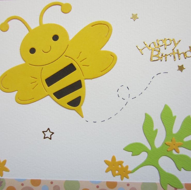 Handmade Happy Birthday card with a bee and leaf design made from die cuts. Inside there is a matching paper border and no words.