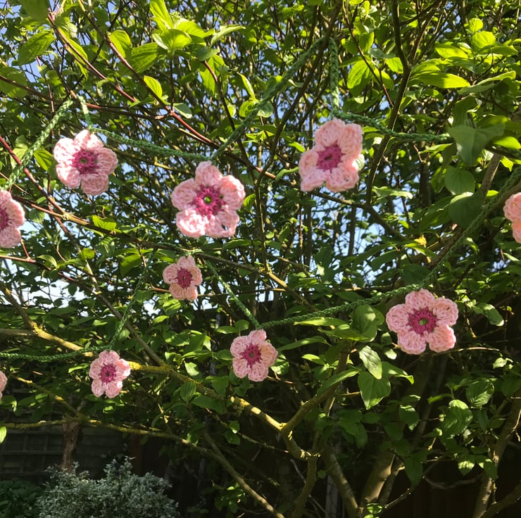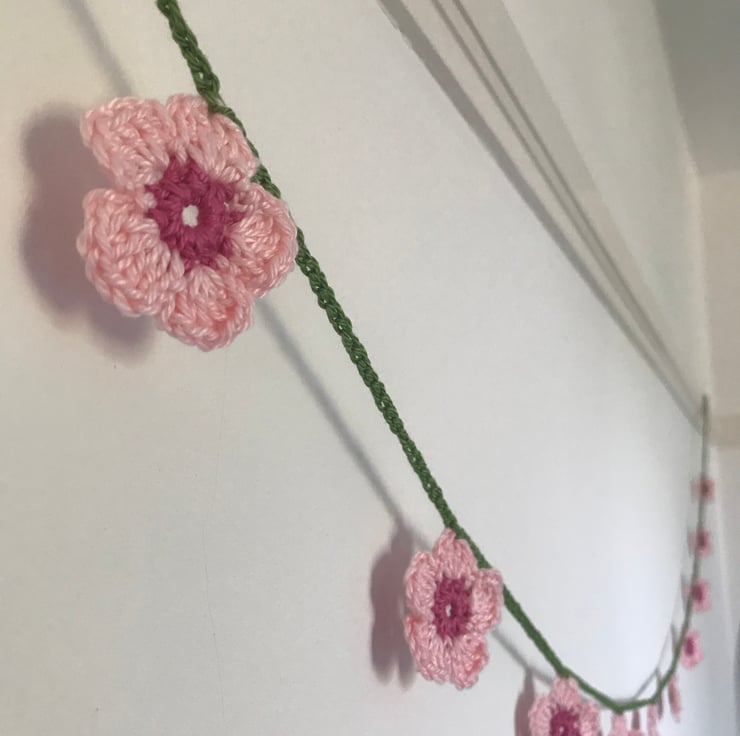 This pretty bunting is made up of a line of crocheted pink Cherry blossom flowers and would look lovely decorating any area. Use in a nursery or draped around picture frames or a small mirror. Or buy as a gift for a friend.