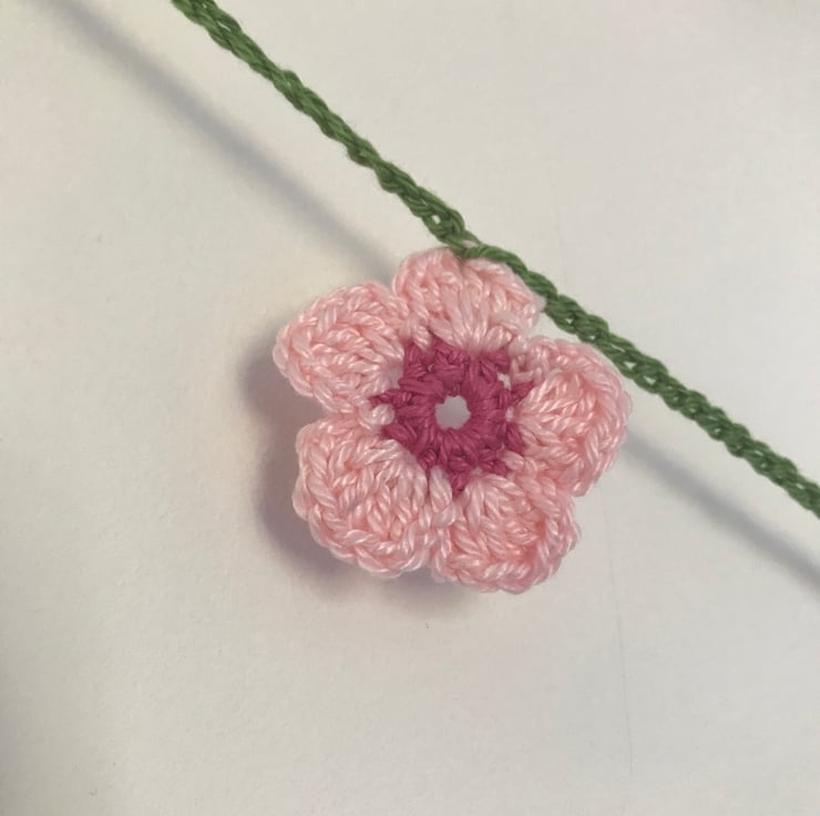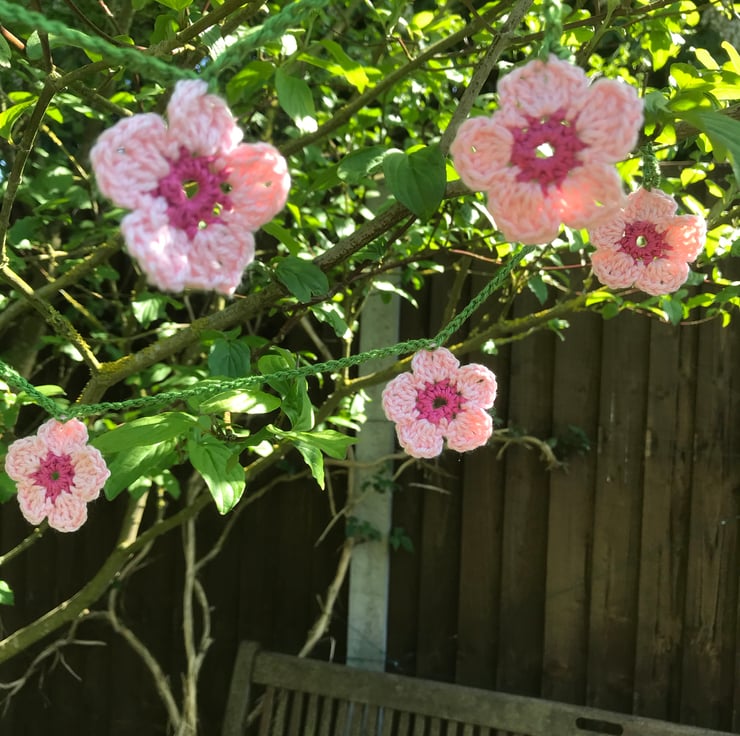 With all the blossom on the trees at the moment I decided to make my own blossom bunting. With pale pink petals and a darker pink centre to the flowers, they are spaced on a mid green chain of crocheted cotton yarn.