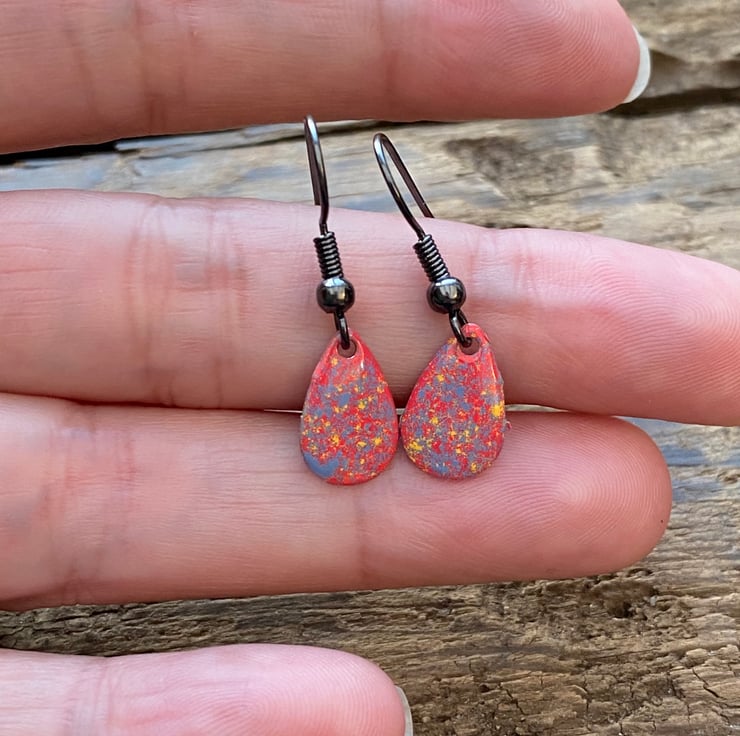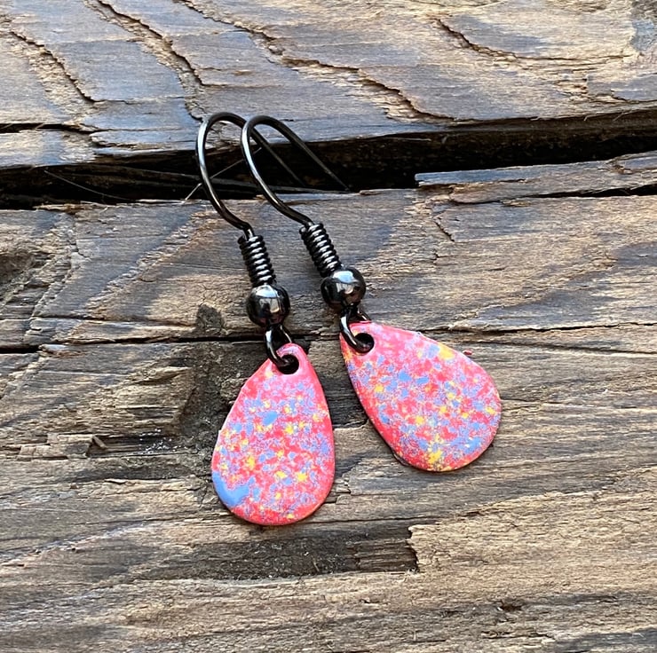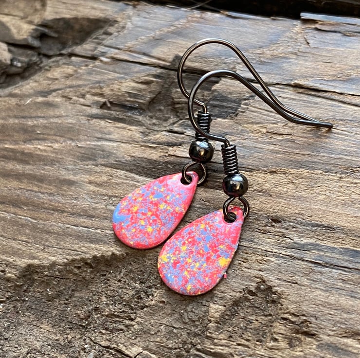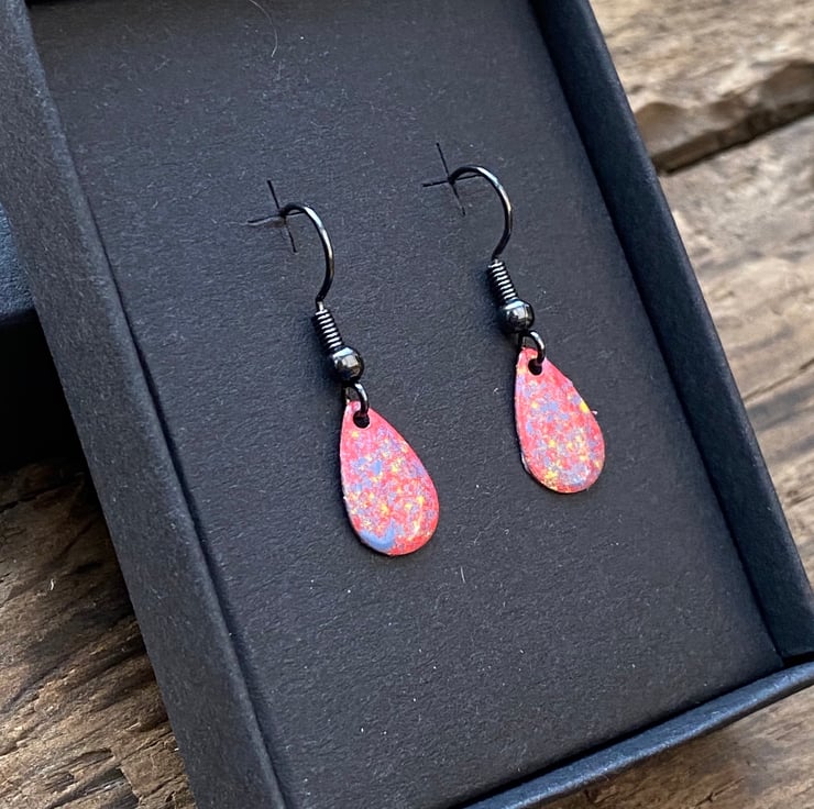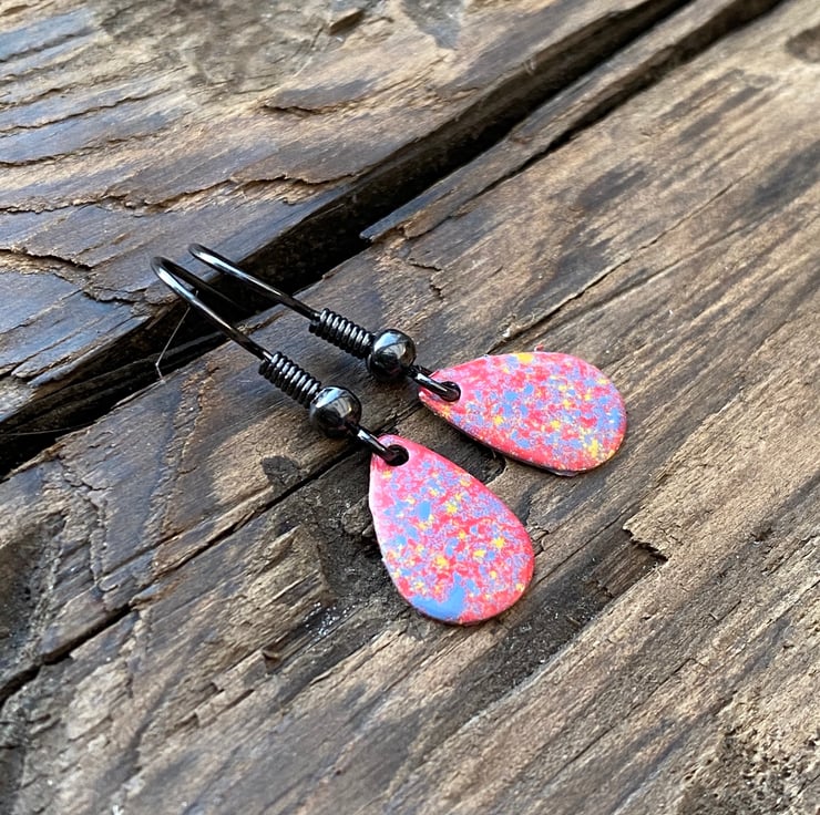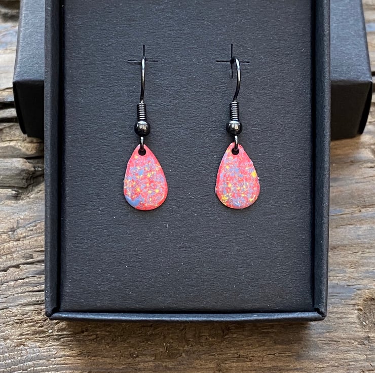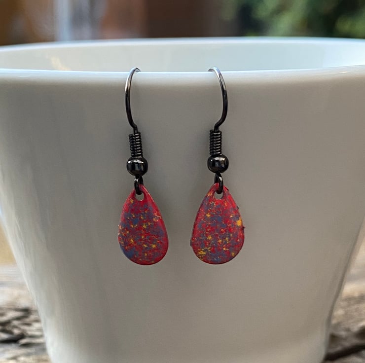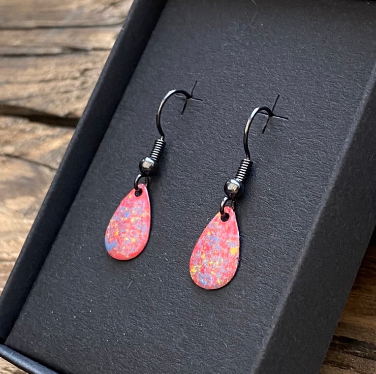 13x8mm silver tone metal charms have been hand enamel in a selection of cold enamel colours. The charms hang from antique black brass earrings, but can be upgrade for an additional cost of £2.50 to Sterling Silver.