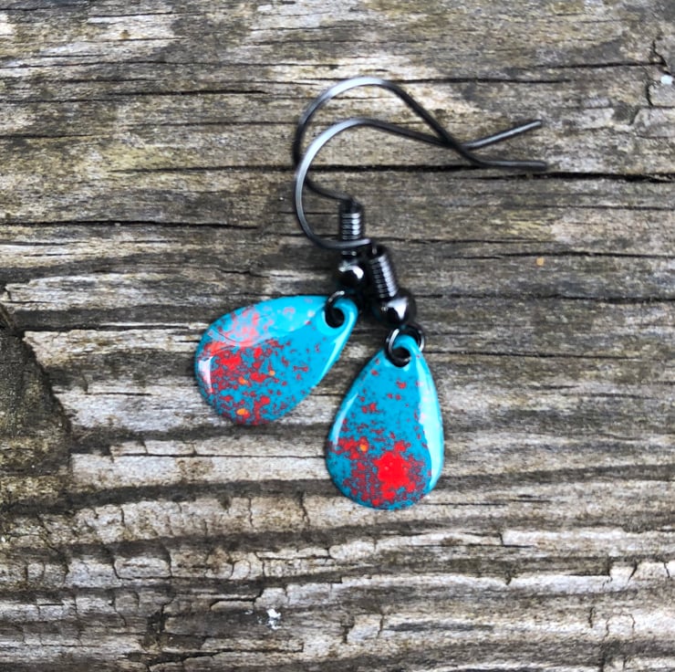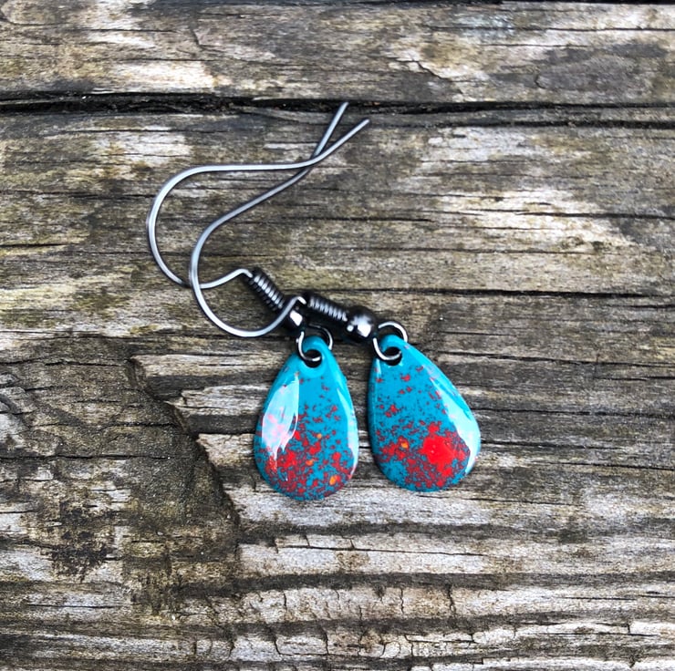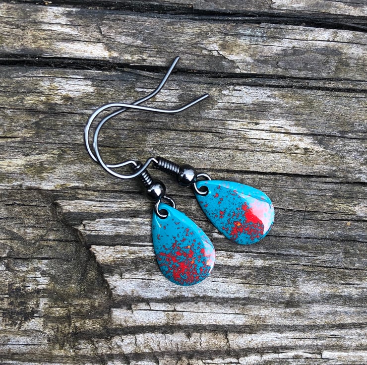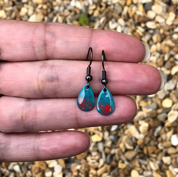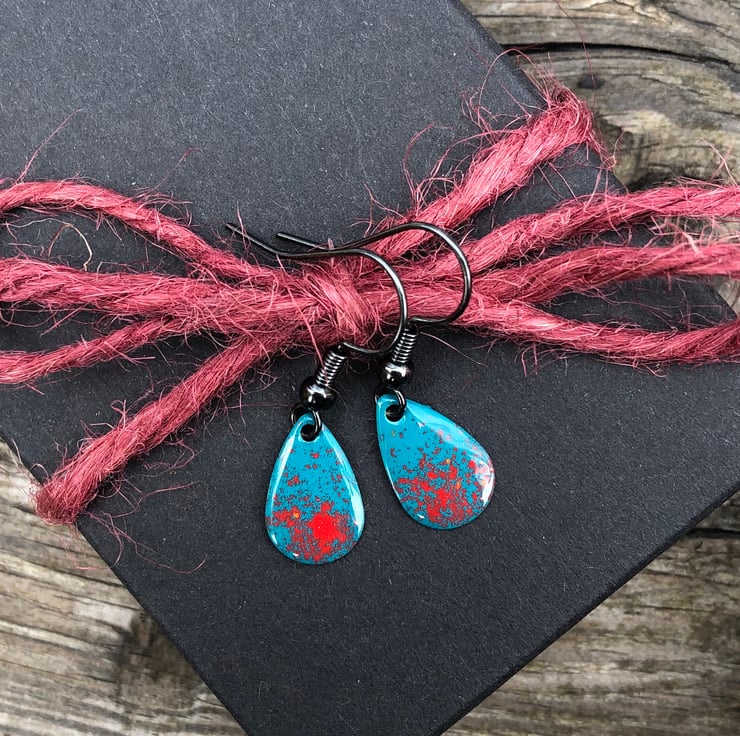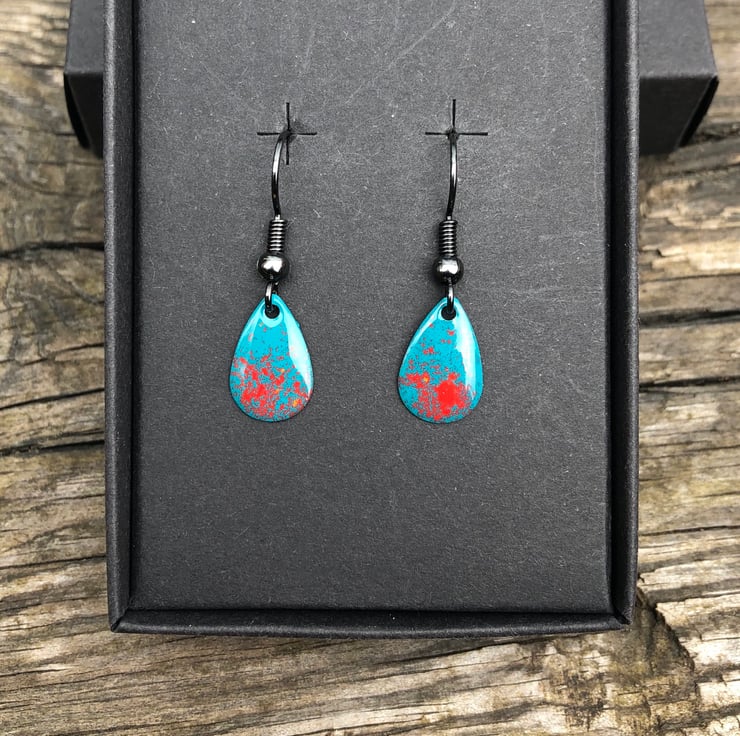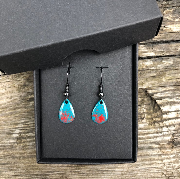 13x8mm silver tone metal charms have been hand enamel in a selection of cold enamel colours. The charms hang from antique black brass earrings, but can be upgrade for an additional cost of £2.50 to Sterling Silver.