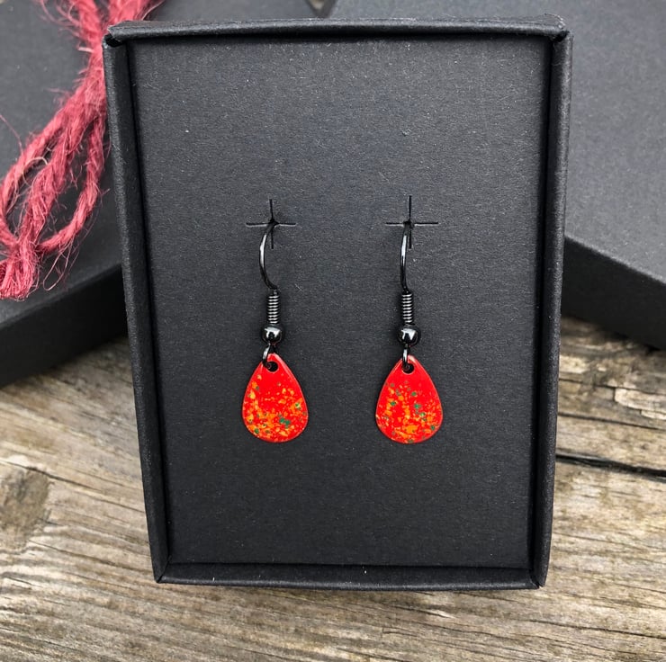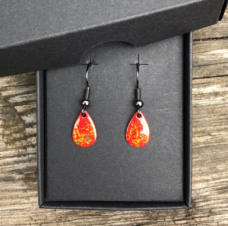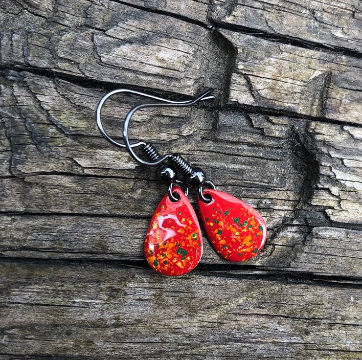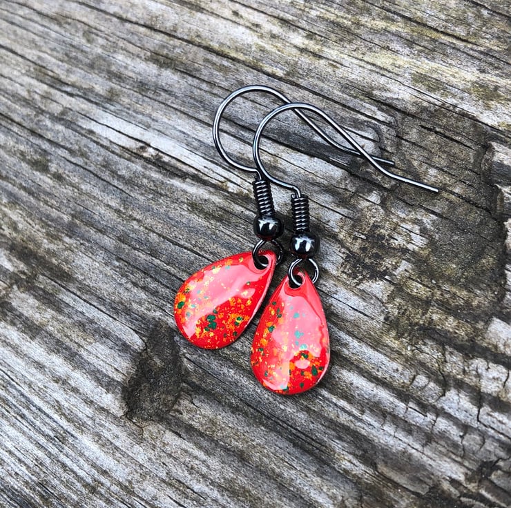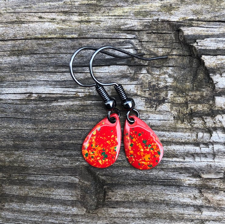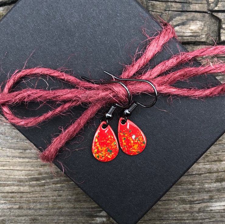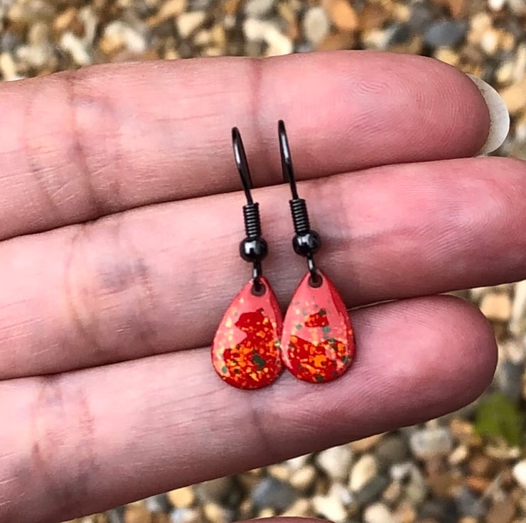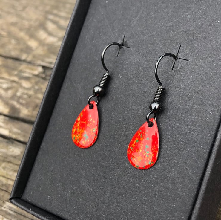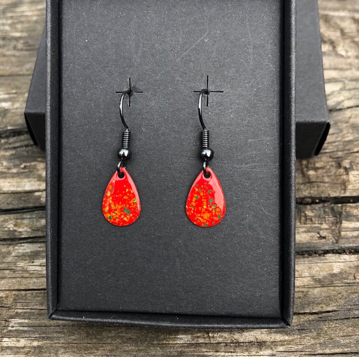 13x8mm silver tone metal charms have been hand enamel in a selection of cold enamel colours. The charms hang from antique black brass earrings, but can be upgrade for an additional cost of £2.50 to Sterling Silver.