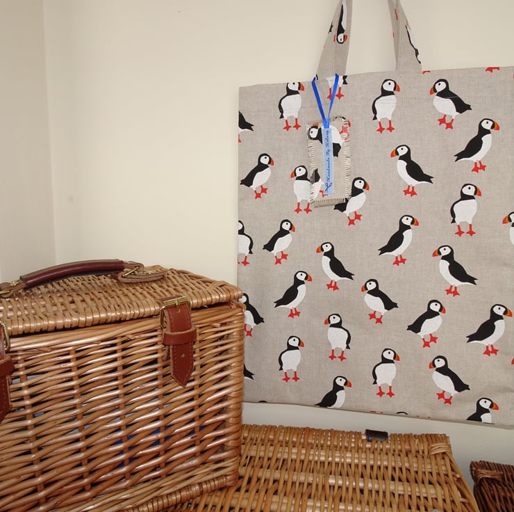 Plastic bags are a thing of the past, so we created our bags out of good quality strong cotton which is built to last. We thought, why not have a reusable bag to keep in a fun and colourful fabric that we would love to use everyday and show off a bit of what we love! We use all sorts of patterns and animal prints, this one has an adorably cute puffin.