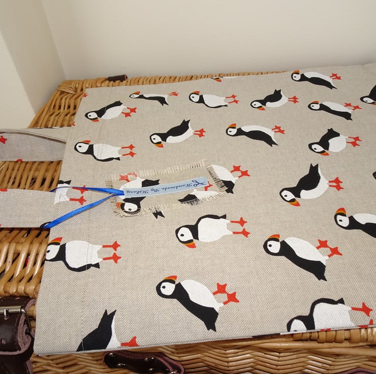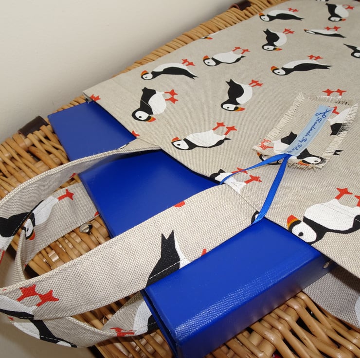 A fun and colourful cotton fabric reusable shopping bag with a super cute puffin design. Lightweight and easily foldable, to fit in a medium sized handbag or rucksack, with super strong short handles.Comfortably fits an A4 folder or magazine. Also ideal for storing items in the home or using as a reusable gift bag. Dimensions: W32cm, H39cm, Handle length 16cm.