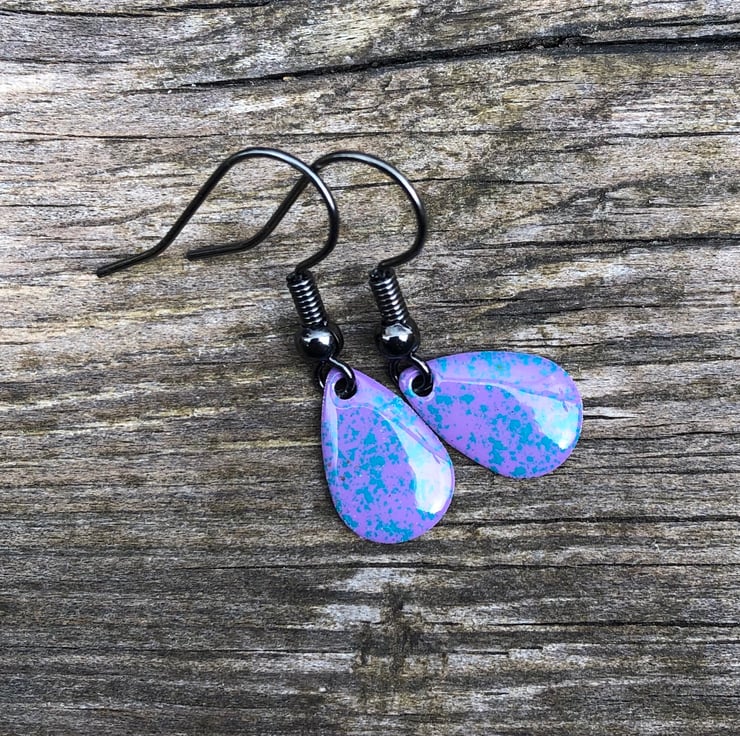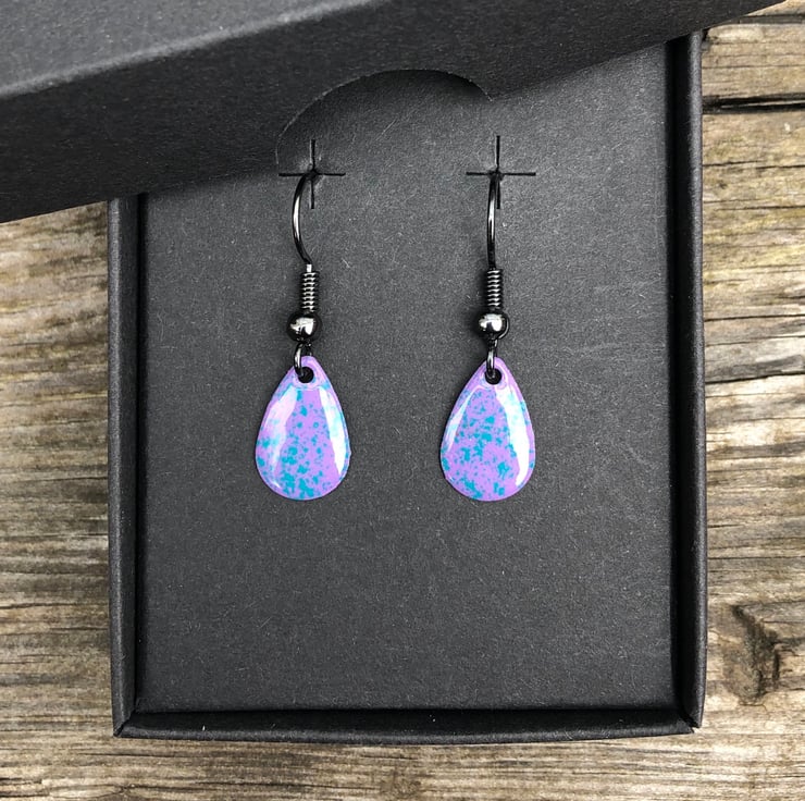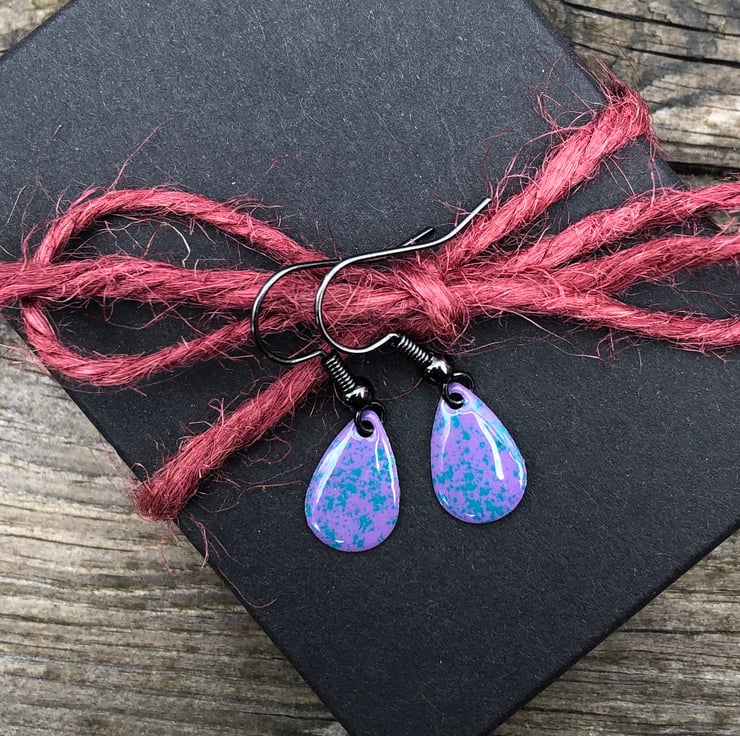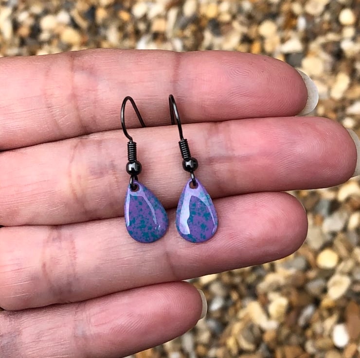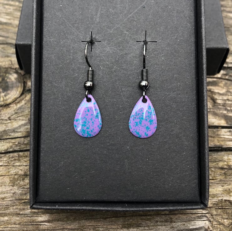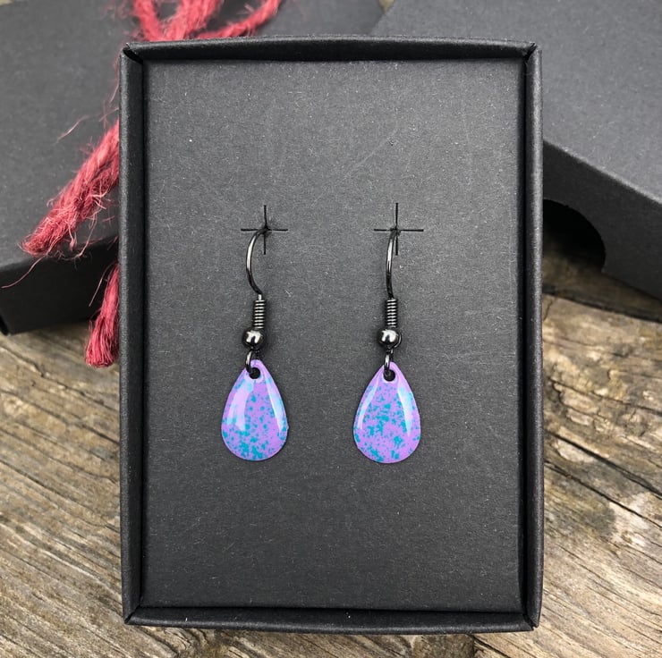13x8mm silver tone metal charms have been hand enamel in a selection of cold enamel colours. The charms hang from antique black brass earrings, but can be upgrade for an additional cost of £2.50 to Sterling Silver.