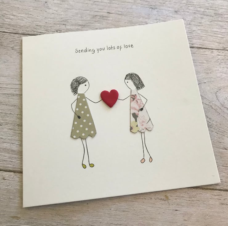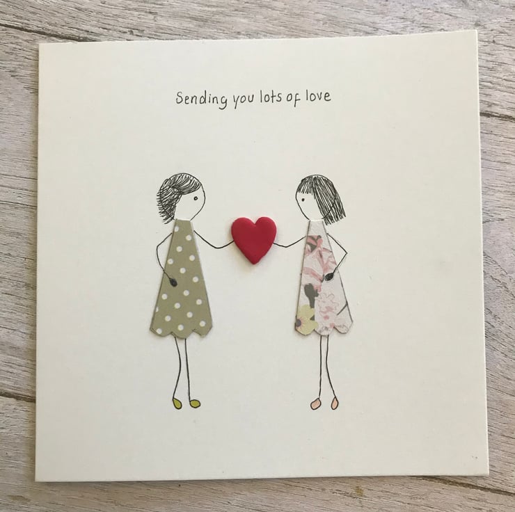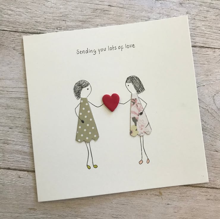 Hand drawn 'Sending you lots of love' greetings card including a handmade polymer clay heart.