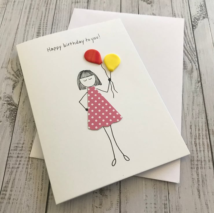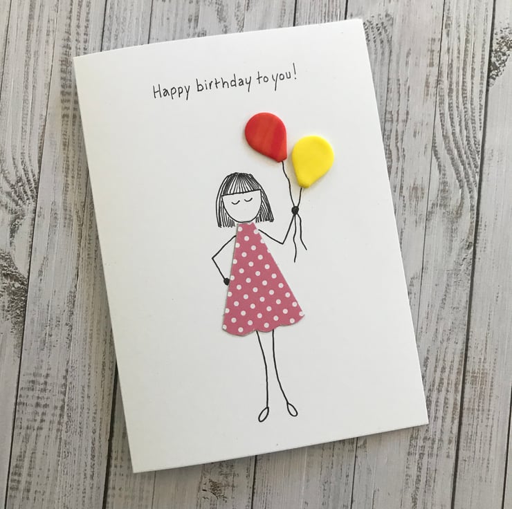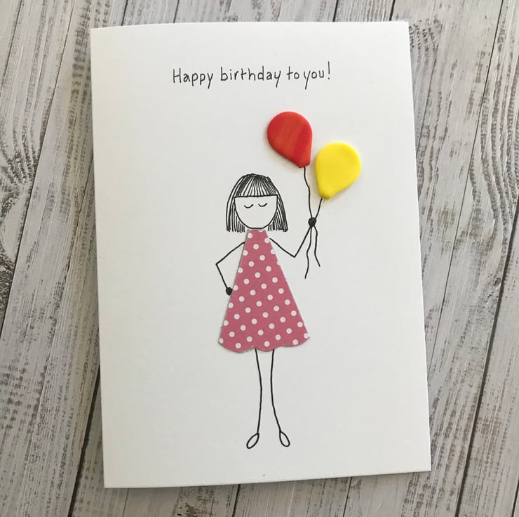 Hand drawn 'Happy birthday to you' greetings card including two hand made polymer clay balloons.