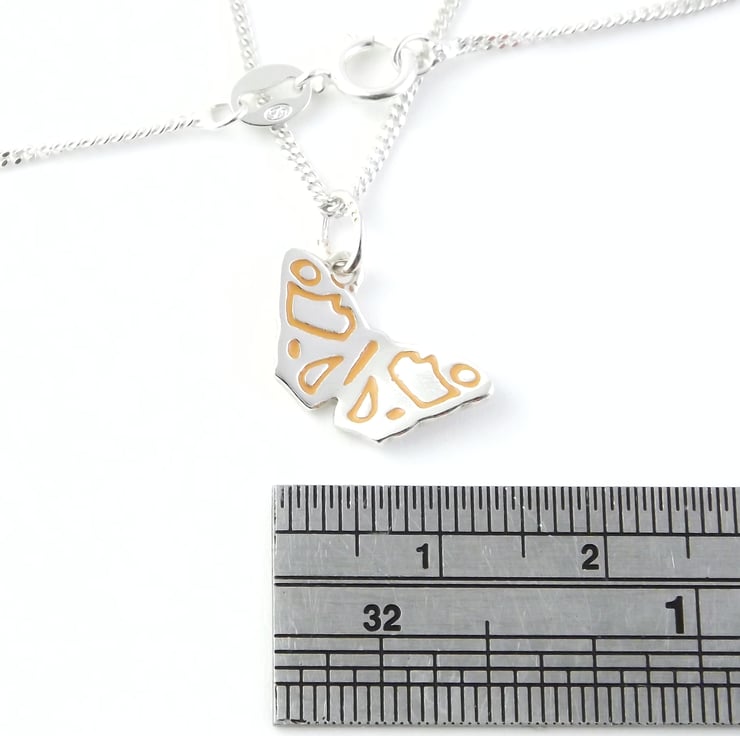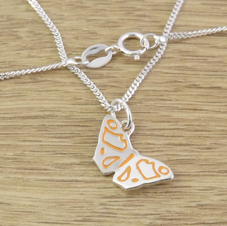 This dainty silver butterfly pendant has been lovingly handcrafted in the UK. It is made from sterling silver sheet and has been etched before being cut by hand, the edges are then smoothed using files and emery paper before it's carefully given there shape using parallel pliers. A 5mm oval jump ring is then attached. A coloured resin based enamel is added to the etched areas and then the charm is polished before being attached to a chain.