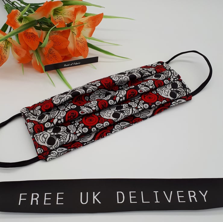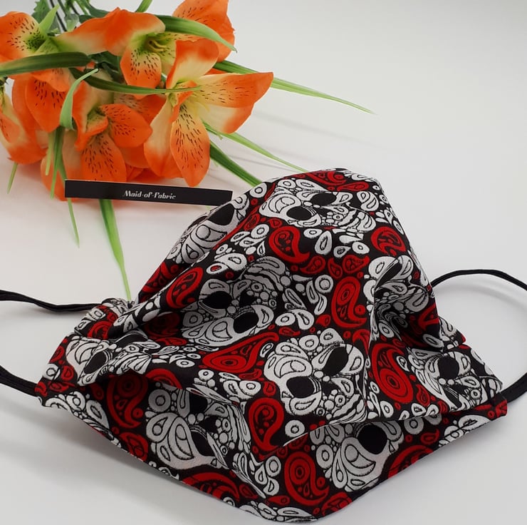 Face mask made using black black, white and red skull patterened fabric.