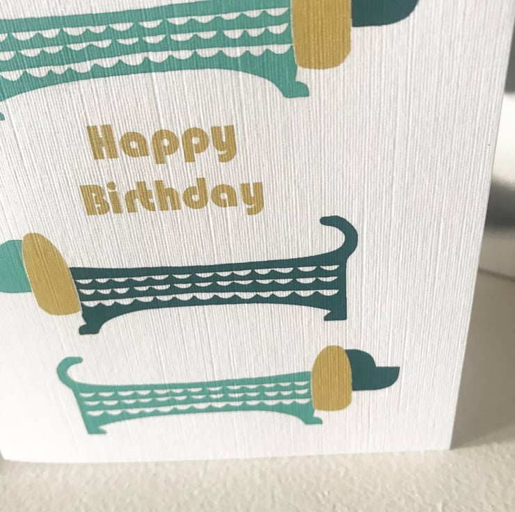 A simple repeat pattern sausage dog birthday card in block colours is perfect for any occasion.