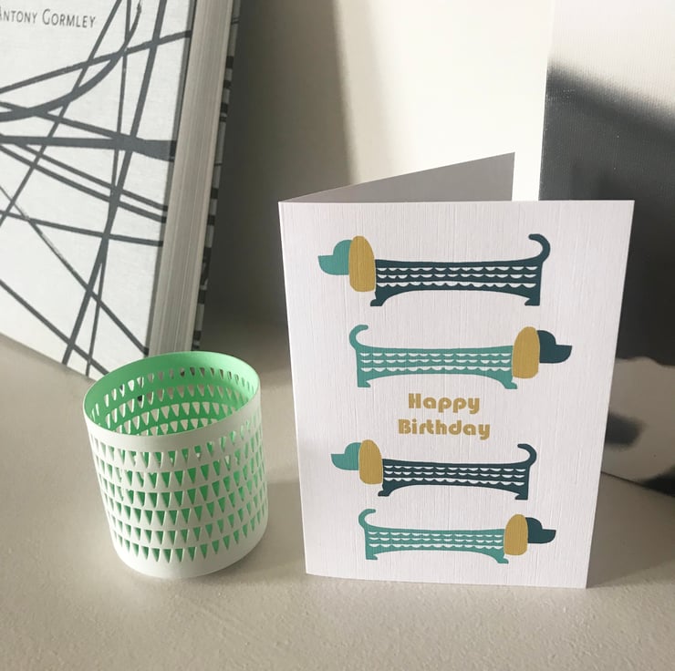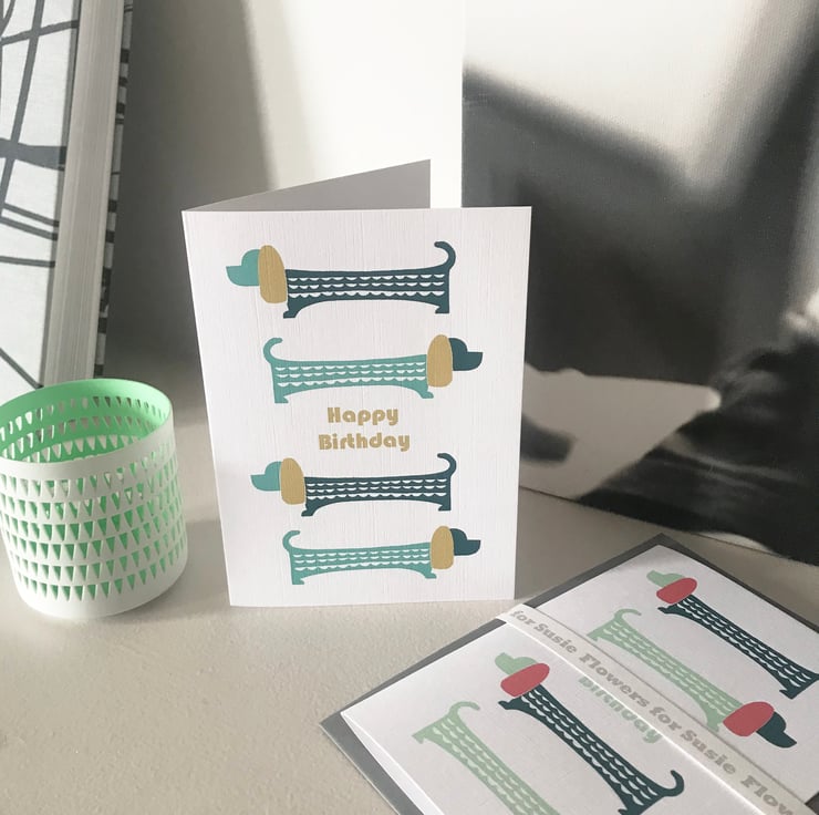 All my designs are Inspired by Scandinavian print and mid century patterns and colour but with a modern take. I suppose the sausage dog idea came from my little boy who desperately wants a little sausage dog to call his own so asked me to design him one. The cards start life as a little sketch in my sketchbook and is then cut in lino & printed by me before being coloured up digitally so the patterns retain their beautiful, simple block print style through to the final card. All my designs are created in my little studio by the sea.