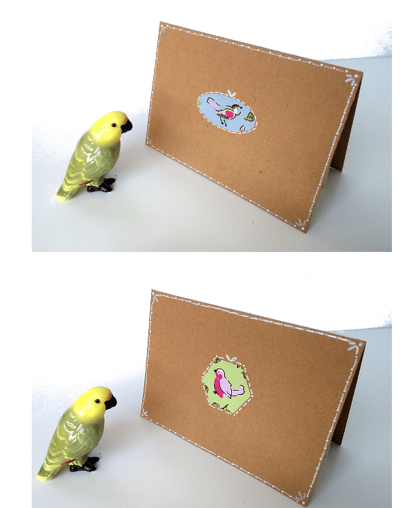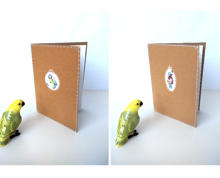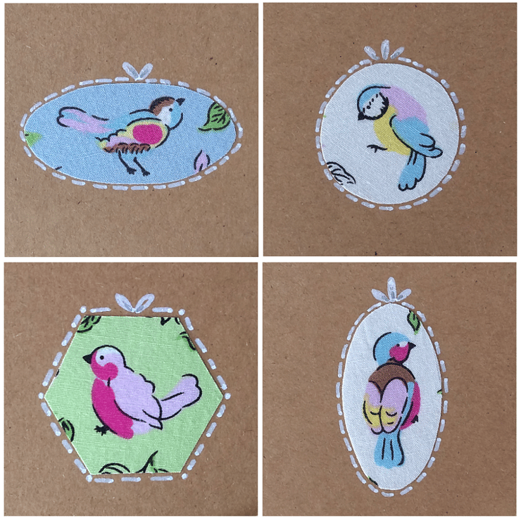 This listing is for a set of four blank cards with applique bird detail on the front. The colourful birds are positioned on elegantly decorated, brown cards. Each card has an ivory paper insert for your message.