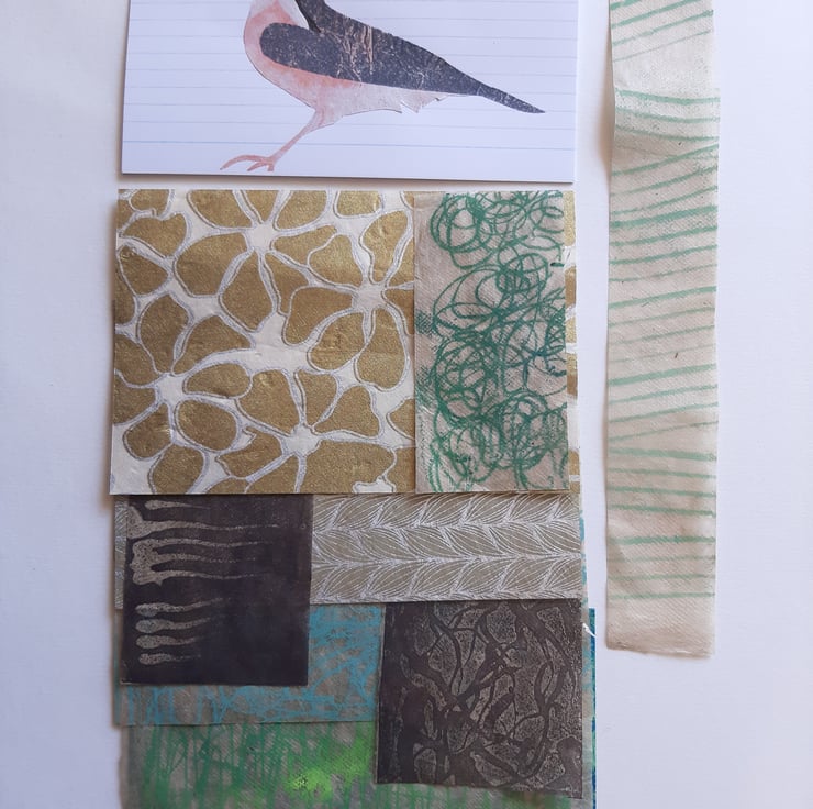 A small collection of handprinted papers left over from my collaged artwork 'The Visitors' and a few other choice pieces from my stash. Index cards for you to assemble your collage on. Just add glue and scissors!
