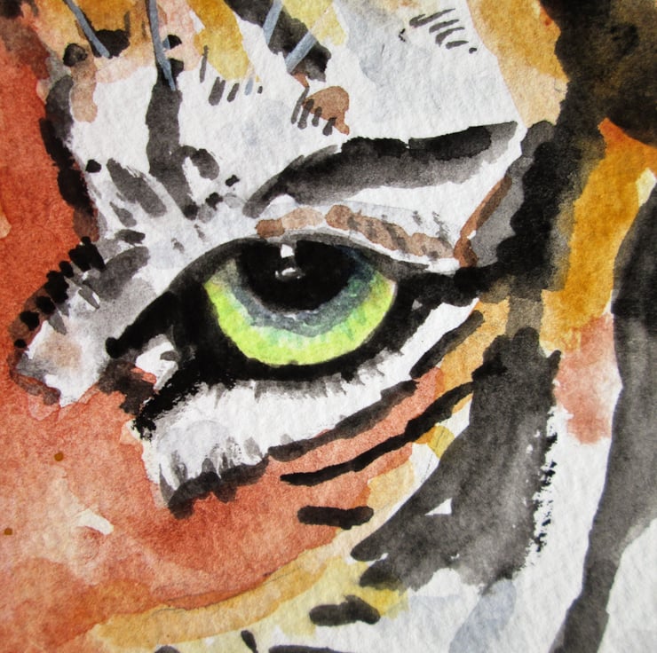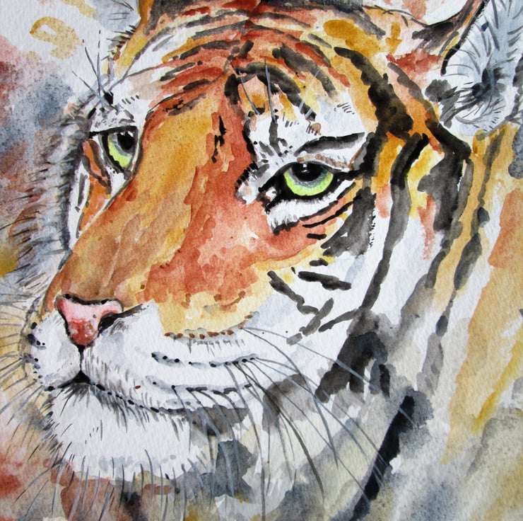 I like to zero in on the eyes and work my way from there. Tigers with their lovely contrasting stripes are not easy to capture on a painting. I used a loose style in watercolours.