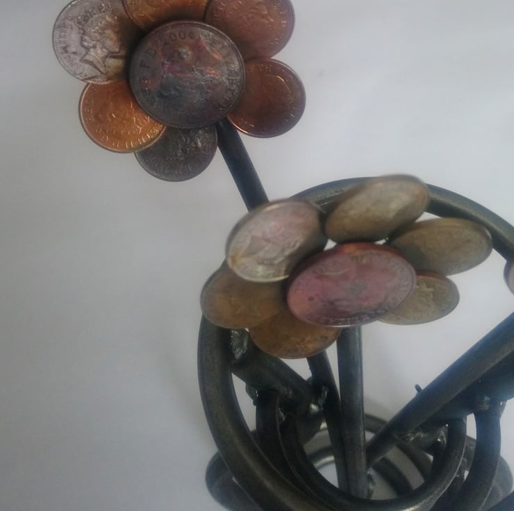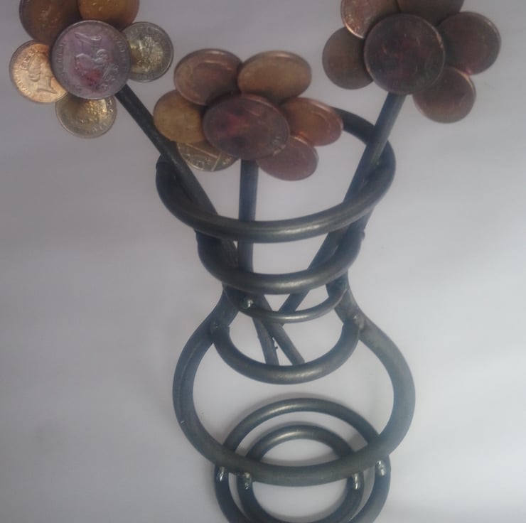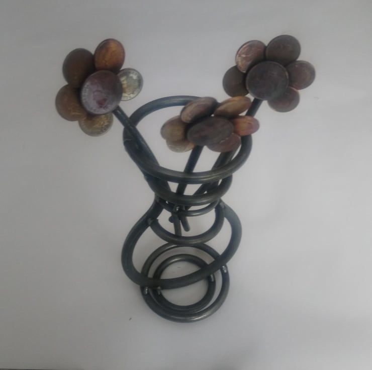 There's always lots of old change laying about, so we decided to make something interesting and original out of it. Hey presto! The steel vase and coin flowers were born.