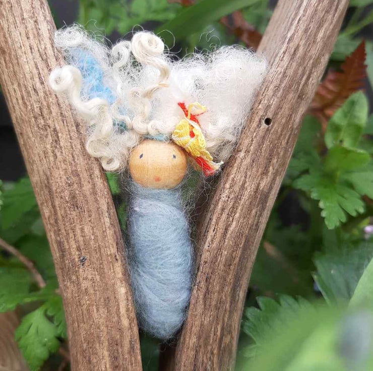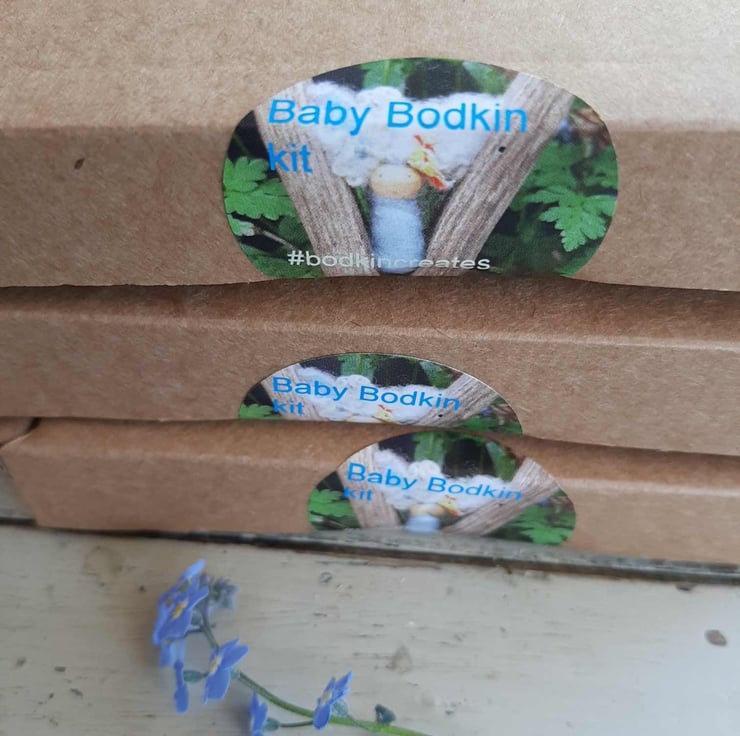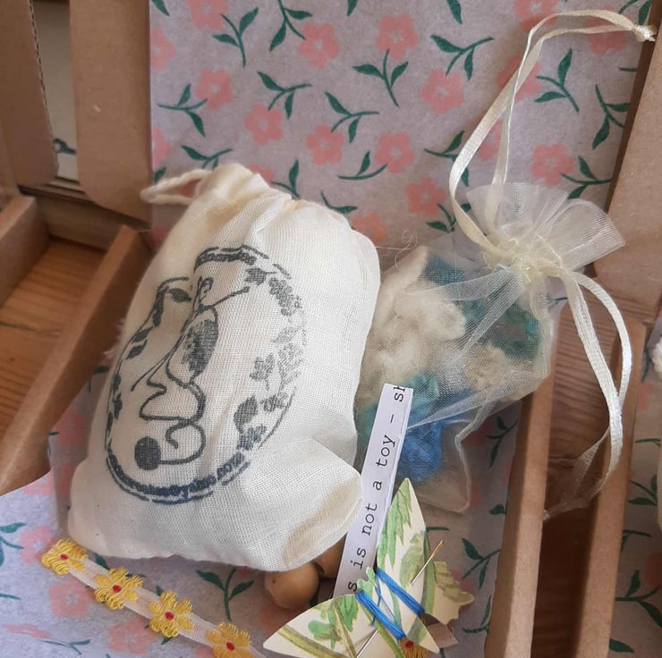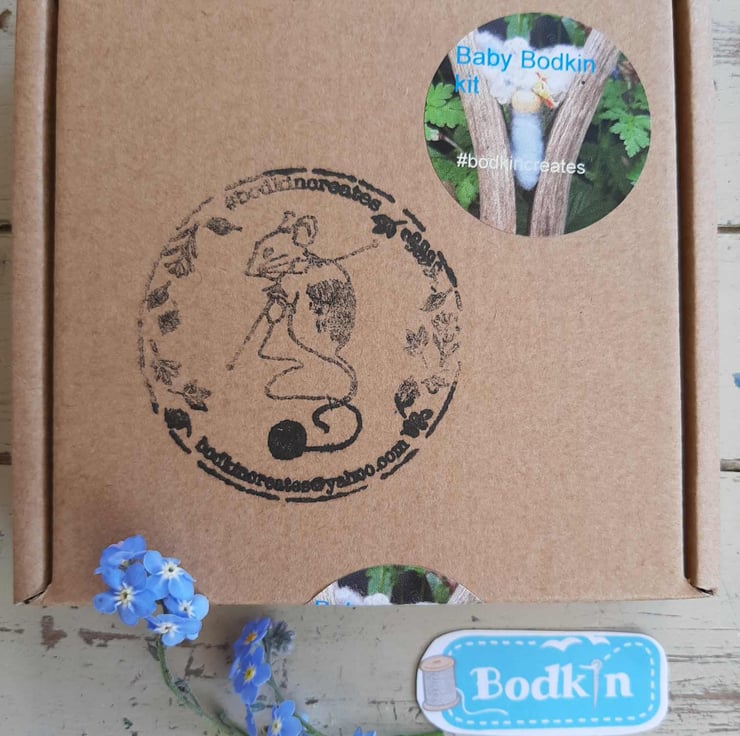 This little box has every thing you need to make three little baby bodkins in soft spring blue and white merio wool.its up to you were you hide them or wear as a brooch. Not for the very young as ends to pipe cleaners might harm. This one is to celebrate spring and they fo like to sit in flowers.