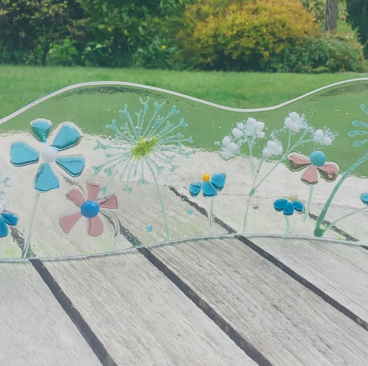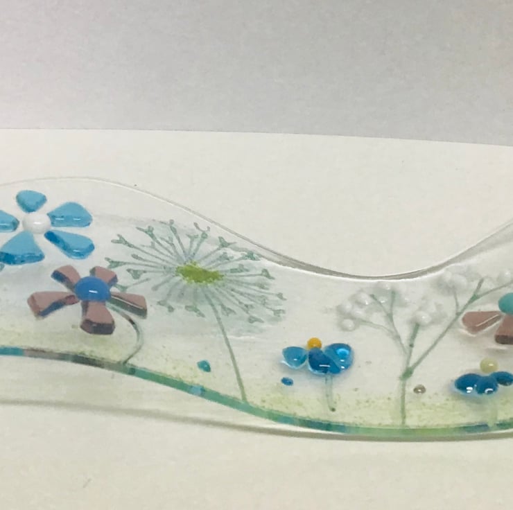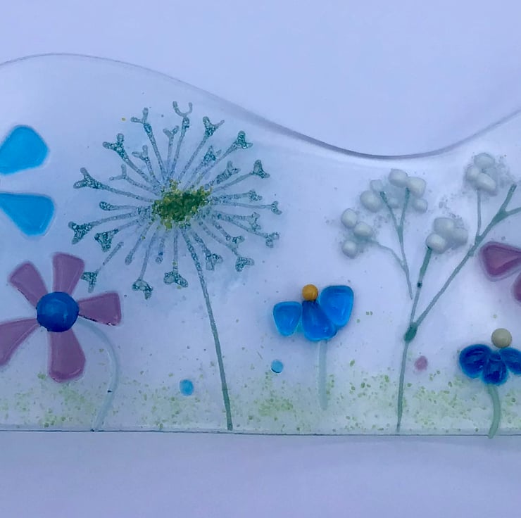Approximately 12 inch long x3.5 inch high this pretty meadows glass wave makes a lovely addition to your home . - the flower petals and wave are all hand cut then. Fused in my kiln in two separate firings ...each one approximately 12 hours . Pale purple with blue and light green ...a gentle calming colour . 2 available . Slight variations occur due to being hand crafted