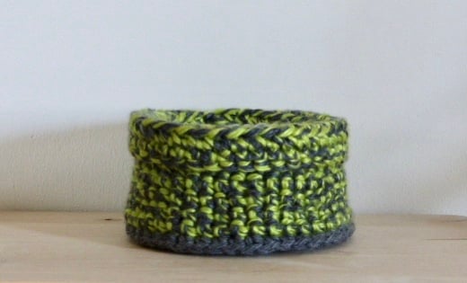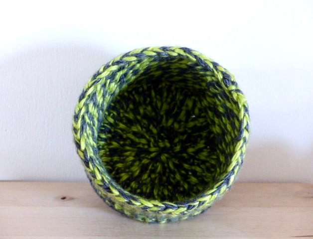 A bright crocheted basket in a lime green/grey colour way. It measures 15cm in diameter by 11cm high and has a grey edging at the bottom. As this is quite a tall container it would possibly suit a plant pot or just turn the top down (as in the second photo) for a shallower basket. Ideal for bits and bobs in your craft space or for any other small items throughout the home.